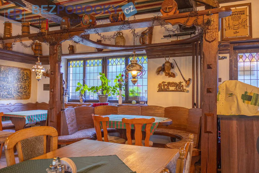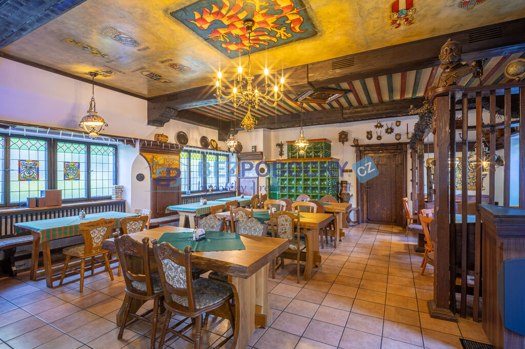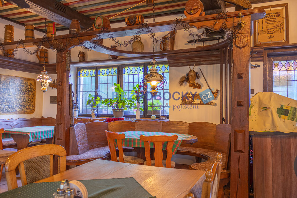 K hotelu patří také restaurace s kuchyní, recepcí a venkovním posezením a v podzemním podlaží prostorná stylová vinárna se samostatným vchodem a zázemím.