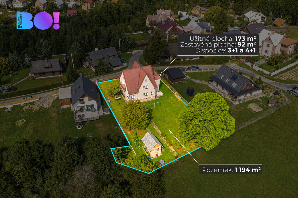 Dům je celý podsklepený – najdete zde místnost s kotlem, dvě menší místnosti, prostornou garáž a dílnu. Součástí je také hospodářská budova a rovinatá zahrada o velikosti 1194 m², ideální pro relax, zahradničení nebo třeba dětské hry.