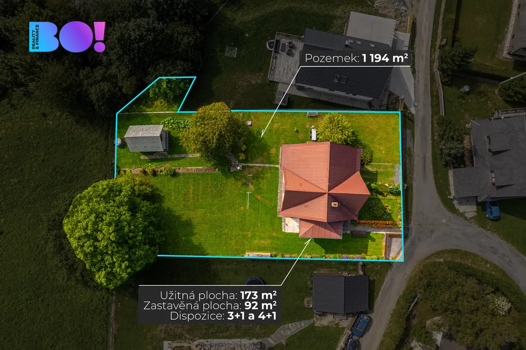 Užitná plocha domu je cca 173 m², zastavěná plocha 92 m².