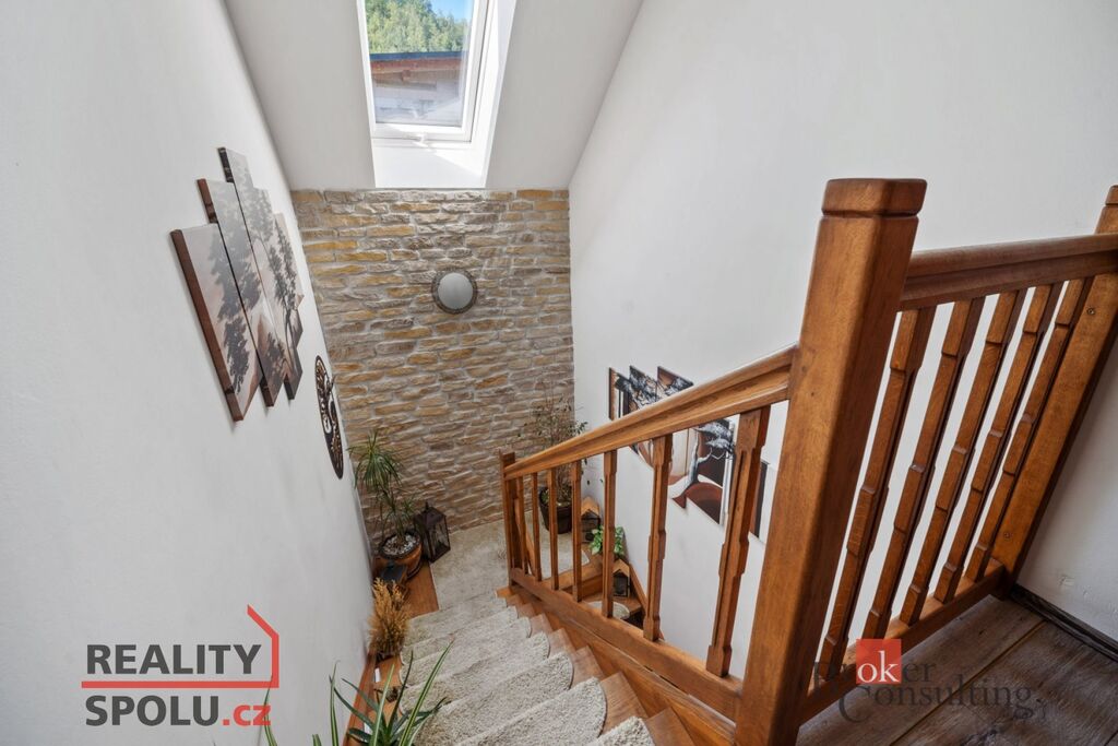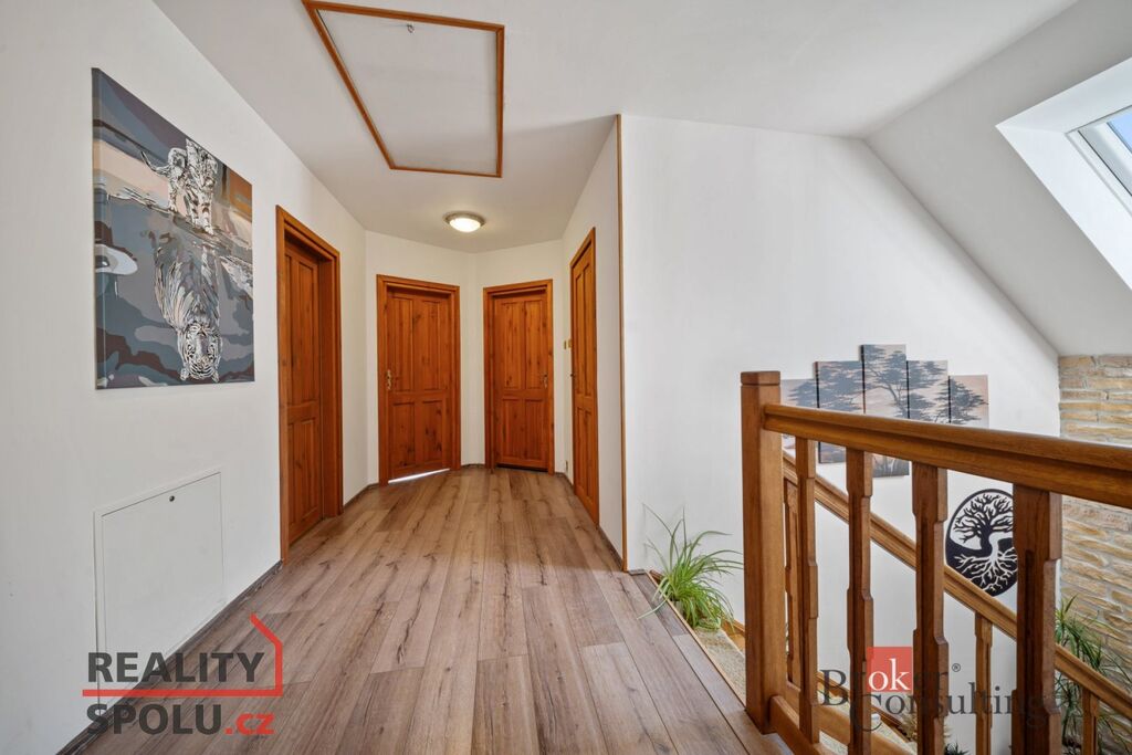 Dispozice domu 5+kk nabízí vstupní chodbu, světlý obývací pokoj s krbem a přímým vstupem na terasu, čtyři ložnice, jedna koupelna v přízemí se sprchovým koutem, druhá koupelna ve druhém patře s prostornou vanou, šatna, sklad, spíž a technická místnost.