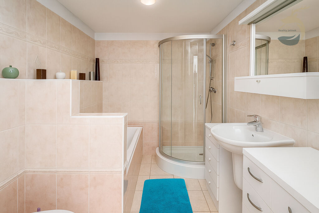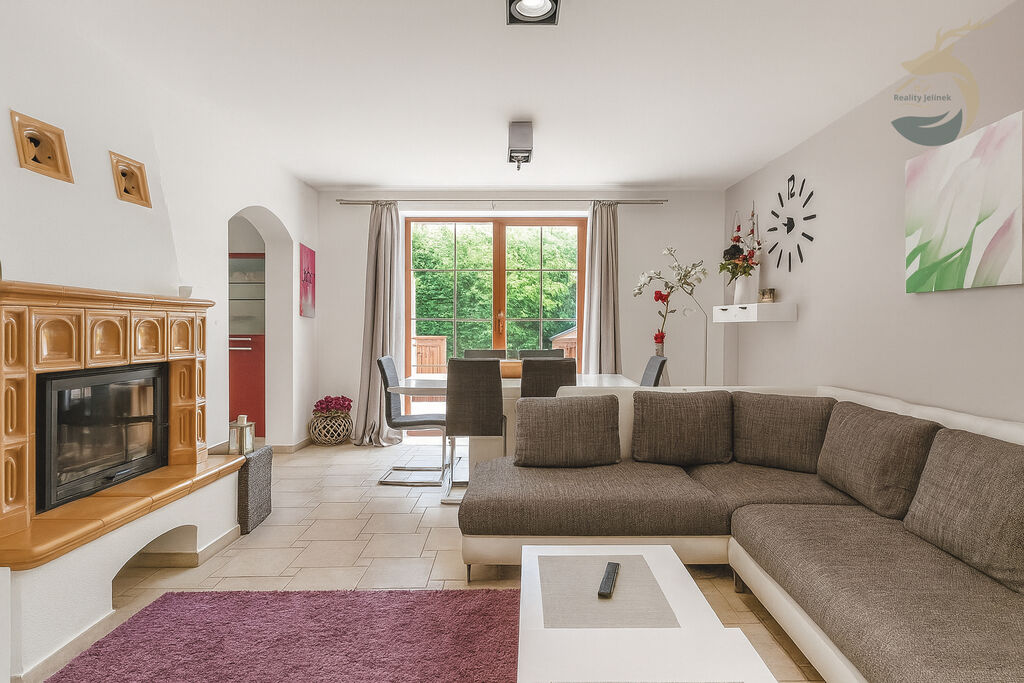 Byt se nachází v 1. nadzemním podlaží menšího rekreačního domu s pěti apartmány. Je kompletně vybavený a připravený k okamžitému užívání. Dispozice tvoří vstupní hala s úložnými prostory, hlavní koupelna s vanou i sprchovým koutem, dvě ložnice a prostorný obývací pokoj s jídelní částí a moderní kuchyní. Obytný prostor o rozloze téměř 38 m² nabízí krb, pohodlnou sedací soupravu a přímý vstup na velkou terasu s posezením. Hlavní ložnice má přes 17 m², druhá ložnice 15 m² a navíc vlastní koupelnu se sprchou a WC.