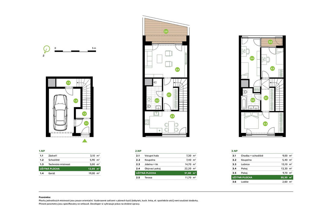 Mezonetový byt o výměře 114,10 m² disponuje v 1. NP garážovým stáním, technickou místností a vstupem do bytu. Ve 2. NP je situován prostorný obývací pokoj, samostatná kuchyně s jídelnou a koupelna s WC a sprchovým koutem. Ve třetím patře jsou pak umístěny 2 pokoje a ložnice, další koupelna s WC a vanou a útulná zastřešená lodžie. V každé bytové jednotce je systém vytápění zajištěn řízeným větráním s tepelnou úpravou vzduchu v kombinaci s topnými foliemi v podlaze a o systém větrání se stará řízené větrání VZT s rekuperací a úpravou vzduchu - zdroj tepelné čerpadlo, s centrálním ovládáním a možností lokální manuální regulace průtoku vzduchu.