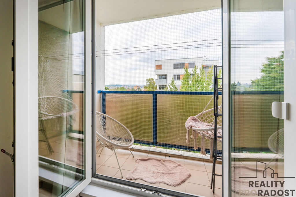 K bytu náleží balkon s plochou 2 m² a sklepní kóje o velikosti 1,75 m² v prvním podzemním podlaží bytového domu.