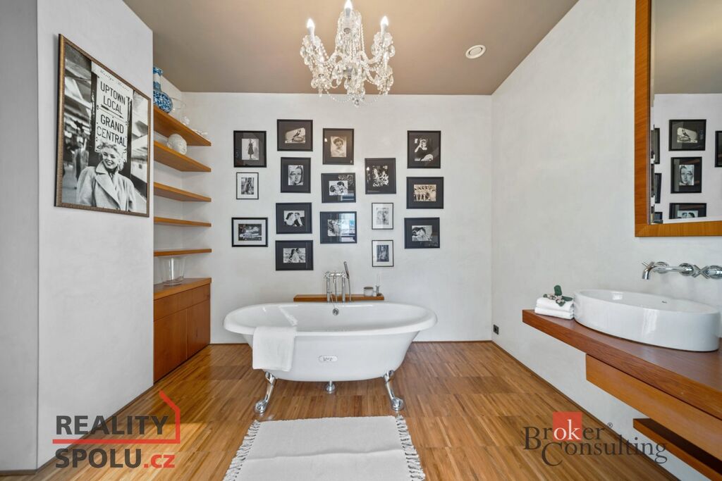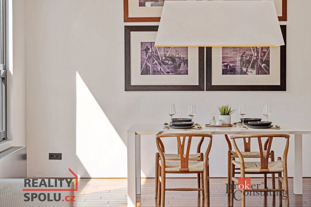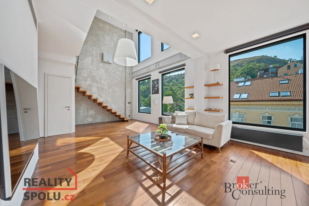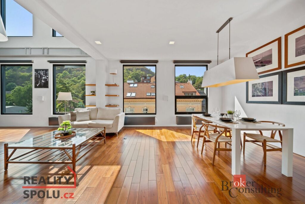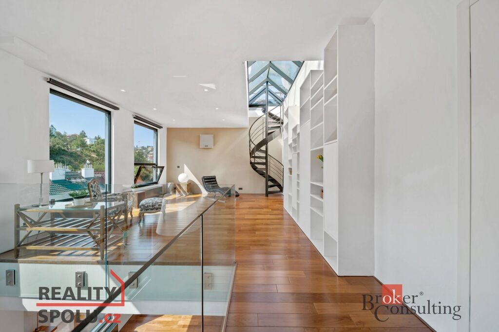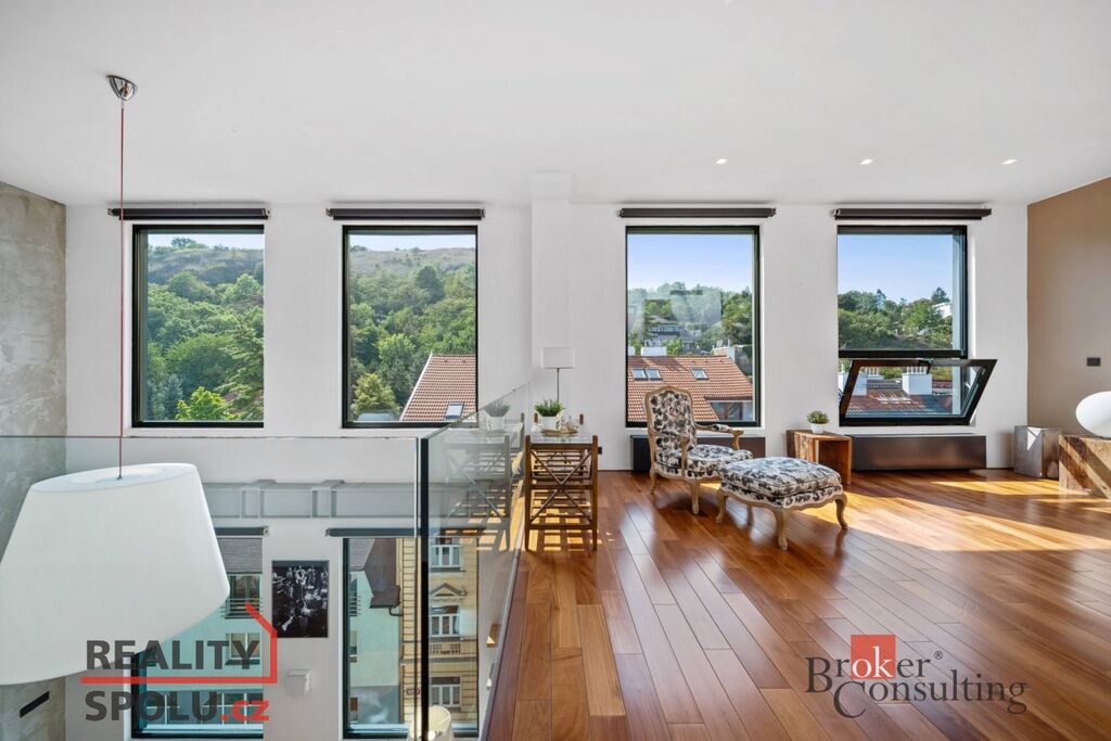 Loftový byt 3+kk se dvěma koupelnami ve 2 patrech o celkové ploše 222 m2 včetně terasy s exkluzivním výhledem. Podlahová plocha bytu činí 142,82 m2 a střešní terasa 78,81m2. Byt se nachází v 6. nadzemním podlaží bytového domu. Vstupní prostorná chodba o výměře 5,81 m2 vede do koupelny se sprchovým koutem o výměře 4,2 m2, šatny 3,76 m2 a do hlavní části – obývacího pokoje s kuchyňským koutem o výměře 60,36 m2. Přes schody umístěné v obývacím pokoji se dostaneme do dalšího patra, kde se nachází galerie o výměře 51,22m2 s ložnicí, šatnou 3,86m2 a koupelnou 10,55m2. Z patra se přes schodiště dostaneme na úžasnou střešní terasu o výměře 78,81m2 s překrásnými výhledy na Prahu a Pražský hrad.