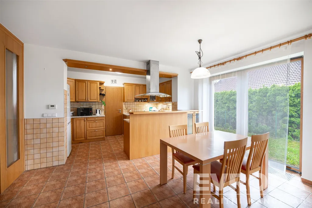 Přízemí: vstupní chodba, technická místnost, koupelna, samostatné WC, komora, prostorný obývací pokoj s kuchyní a spíží, samostatná jednotka 1+kk, schodiště. Navazuje garáž a sklad nářadí.