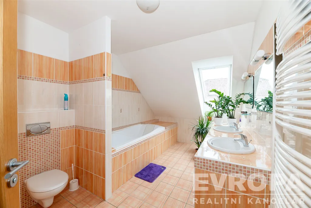 Podkroví: 6 neprůchozích pokojů, chodba, 2 koupelny.