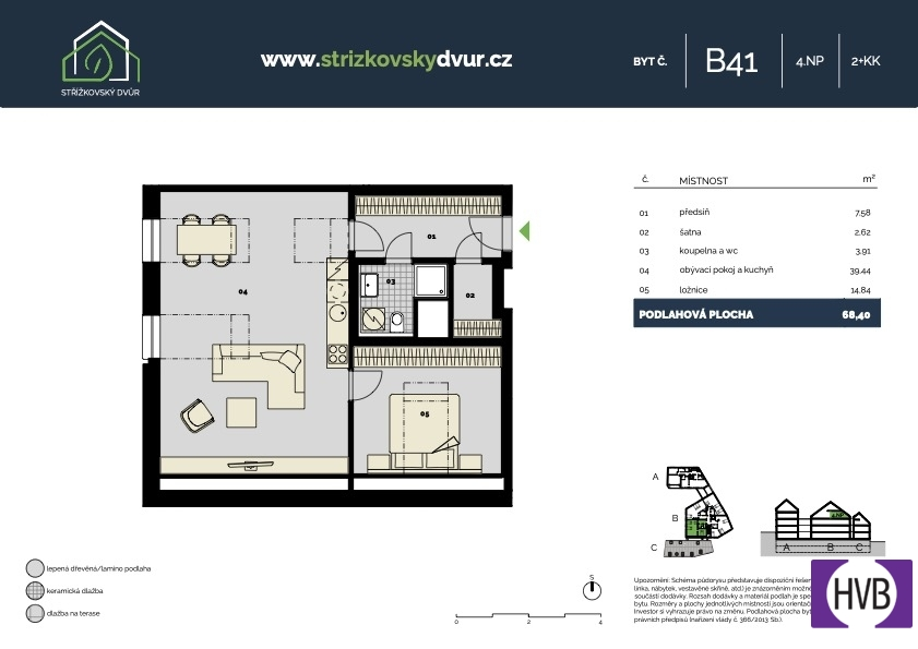 Dispozice zahrnuje vstupní chodbu, prostorný obývací pokoj, ložnici, šatnu, koupelnu se sprchovým koutem a samostatné WC.