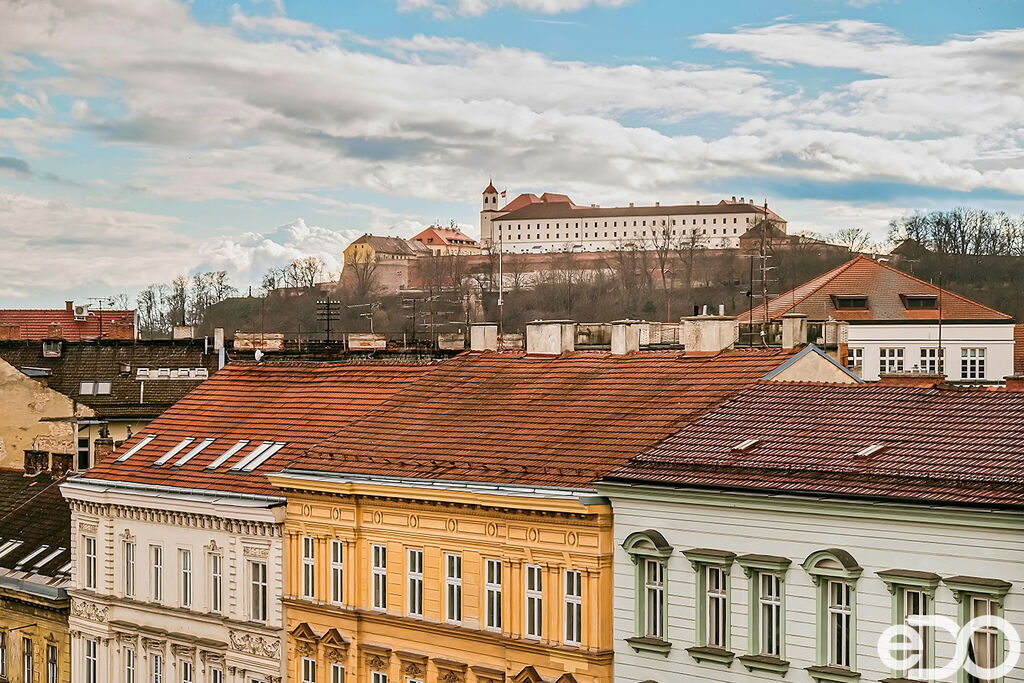 Střešní terasa nabízí jedinečný výhled na hlavní dominanty města Brna - Petrov, Špilberk.