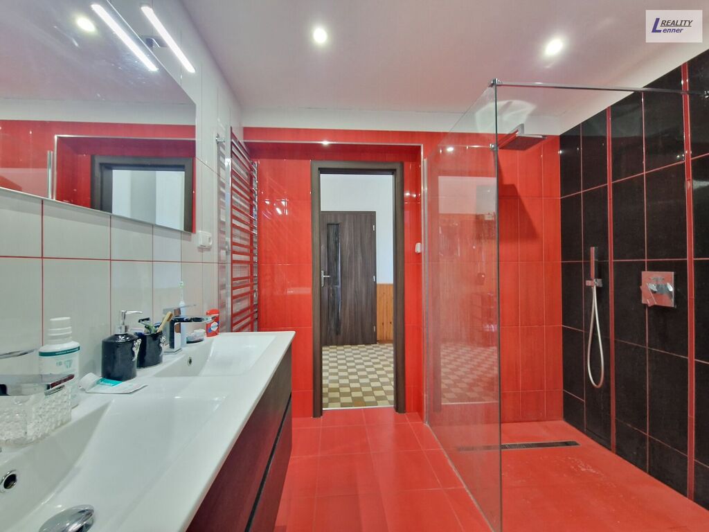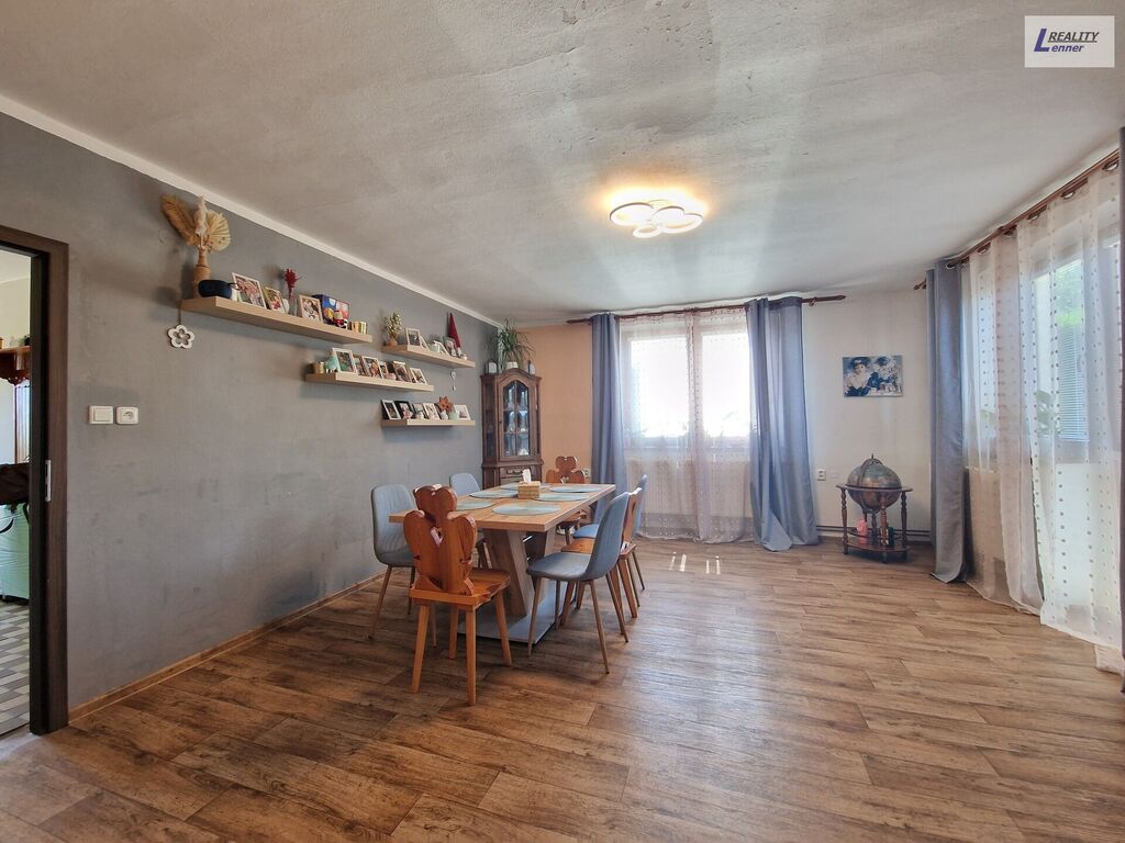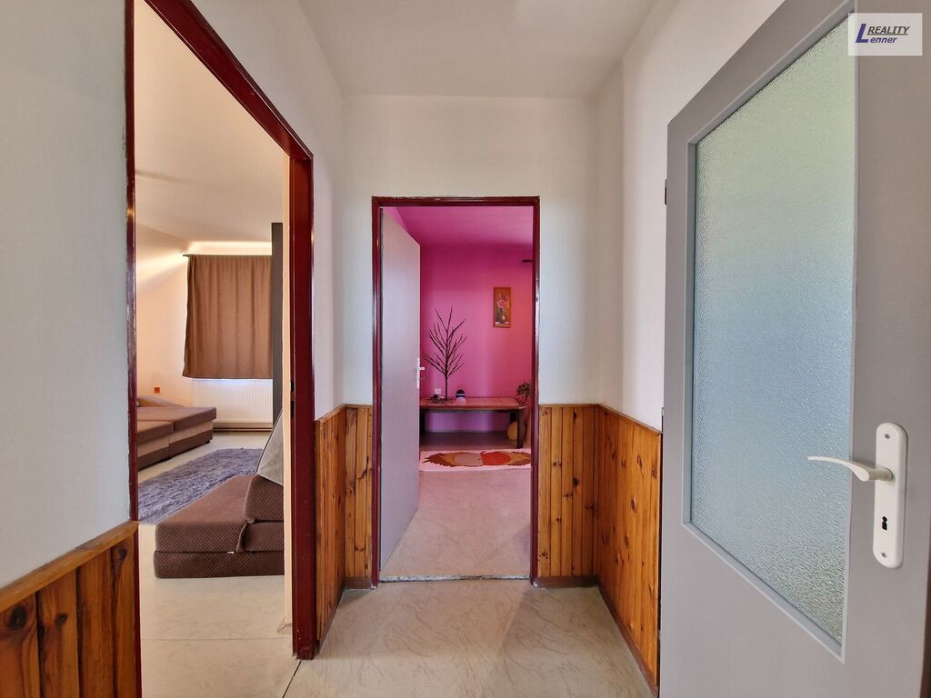 V přízemí domu prostorný byt 2+1(72 m2): chodba (hala), schodiště do podkroví a suterénu, WS Geberit, prostorná ložnice, obývací pokoj s jídelnou, kuchyně s novější kuch. linkou vč. praktické komory (špajz), prostorná koupelna z roku 2020 po rekonstrukci (vč. sprch. koutu a rohové vany).