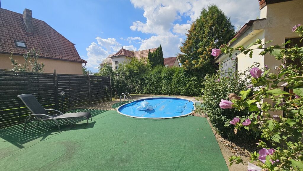 K domu náleží udržovaná zahrada, která vybízí k trávení volného času na čerstvém vzduchu. Najdete zde také bazén, který oceníte zejména v letních měsících, venkovní posezení a garáž pro dvě osobní auta pro pohodlné parkování.