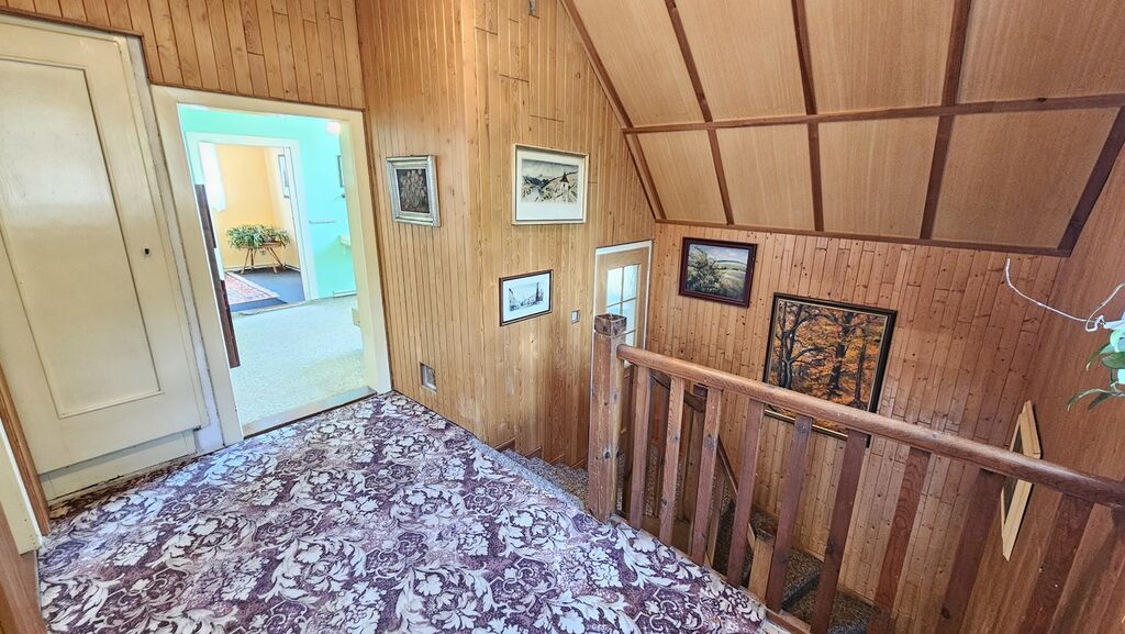 Zvýšené přízemí: vstupní zádveří, obývací pokoj, prostorná kuchyně s jídelním stolem, středová průchozí místnost a koupelna s wc. V mezaninu domu máte k dispozici druhou toaletu.