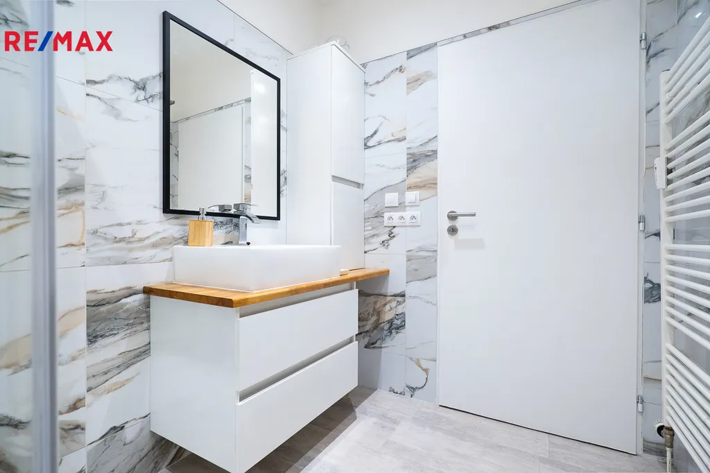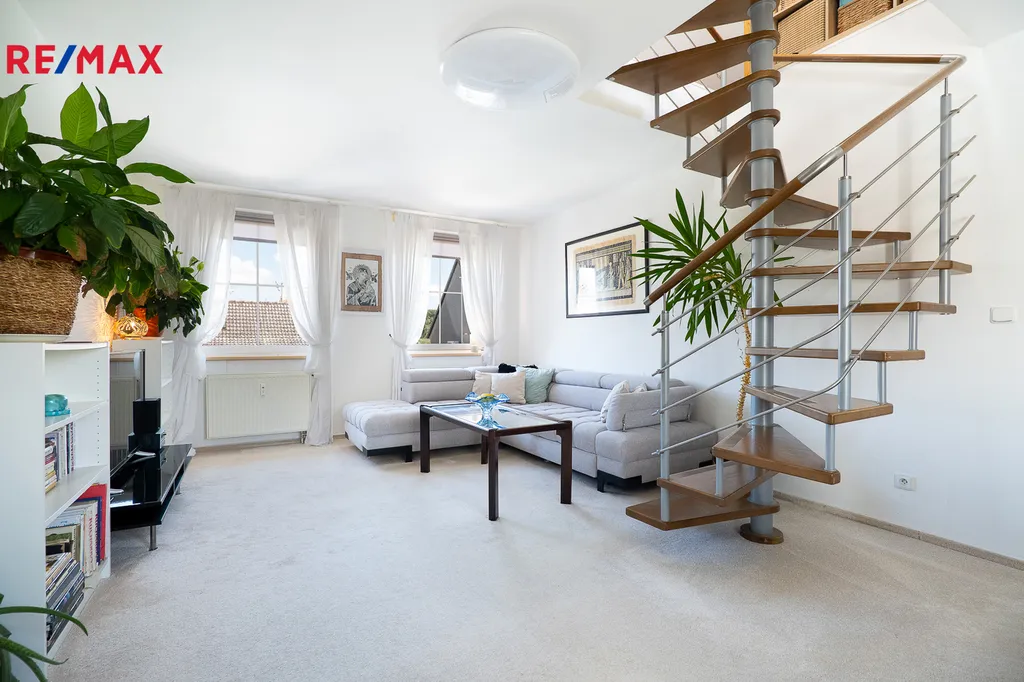 Byt je situován v prvním podlaží a v podkroví. Přístup vede přes schodiště a zastřešenou pavlač, vstup vede z předsíně dok prostorné obývací místnosti (24,96 m²) spojené s kuchyní (11,5 m²) s oknem a novou kuchyňskou linkou (r. 2017) kompletně vybavenou spotřebiči. Na tomto podlaží se nachází ještě prostorná šatna (10 m2) a ložnice (14,78 m2). Komfort poskytuje moderní koupelna se sprchovým koutem, umyvadlem, vestavěným nábytkem a infrasaunou.