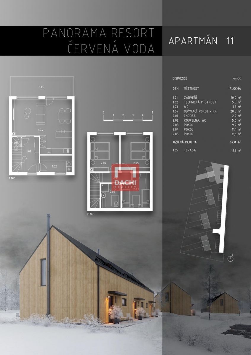 Nabízíme vám exkluzivní horské apartmány v projektu Panorama Resort Červená Voda, který se nachází na pomezí Orlických hor a Jeseníků. Apartmány nabízí úchvatný výhled na ski areál Buková Hora a okolní lesy. Celkem projekt zahrnuje 12 jednotek ve 4 trojdomech s privátním příjezdem, což vám zajistí soukromí a klid.