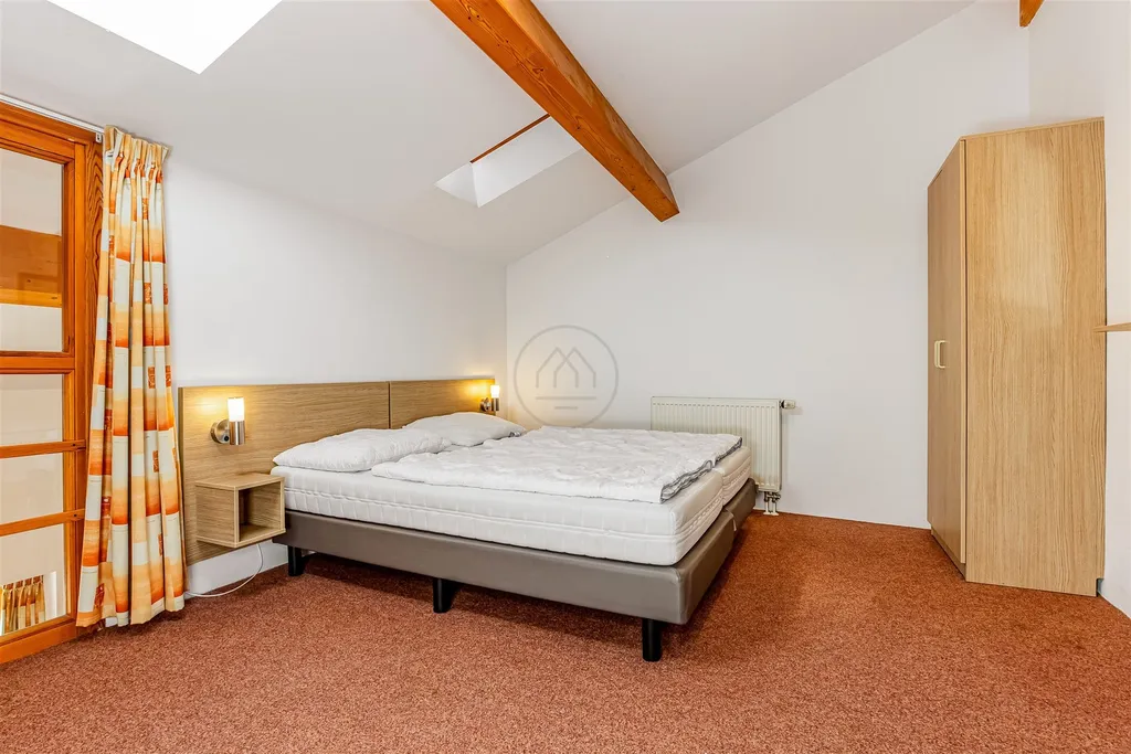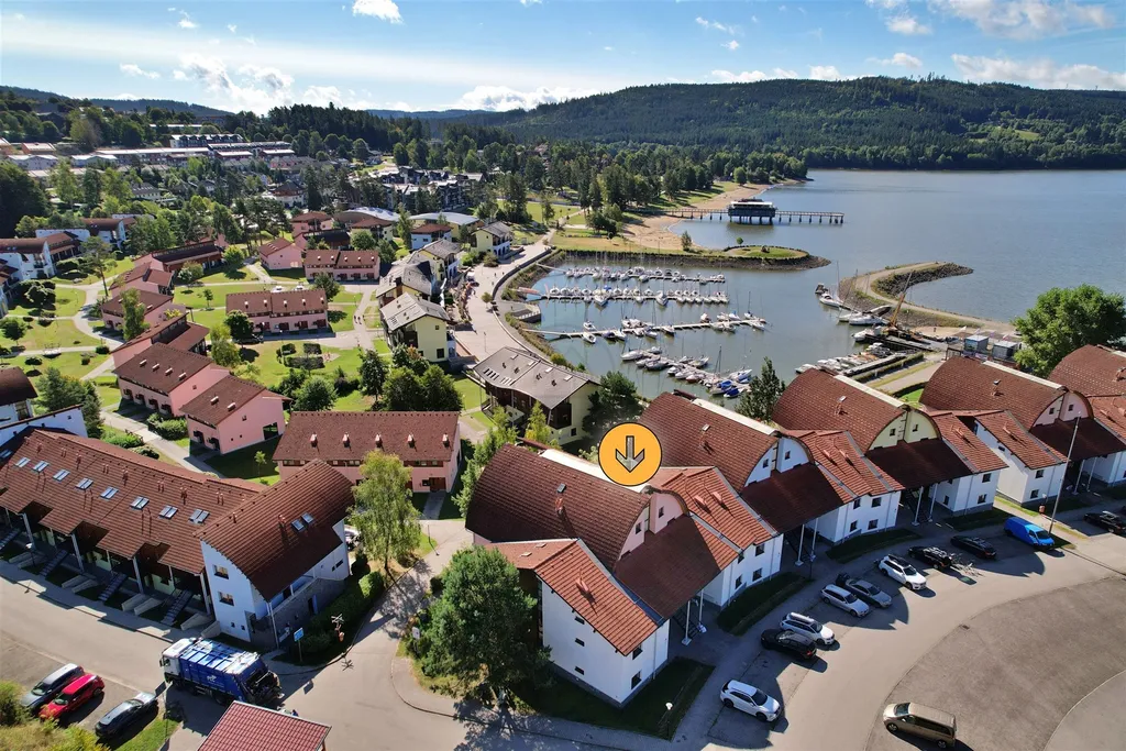 Jedná se o funkčně řešený mezonetový apartmán 3+kk. Ze zádveří je přístupná koupelna, samostatné WC a hlavní ložnice. Další prostor navazuje do světlého obývacího pokoje spojeného s moderní kuchyní a vstupem na balkon, odkud se otevírá nádherný výhled na jezero. V horním patře se nachází další ložnice, ideální pro rodinu nebo hosty.