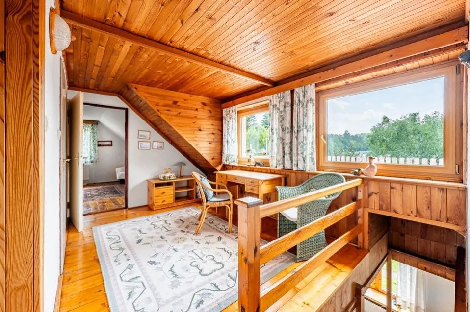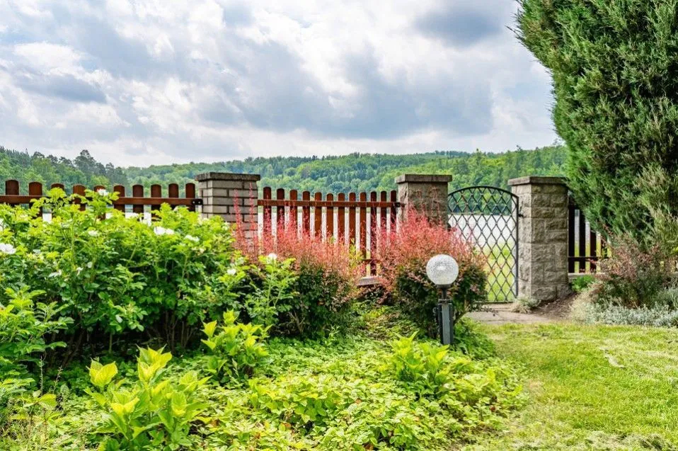 Mimořádně prostorná a okouzlující zahrada se vzrostlými stromy poskytuje soukromí a navazuje mimořádný pocit nerušeného prostředí a intimity. Pozemek bezprostředně sousedí s rybníkem a má k němu soukromý vstup.