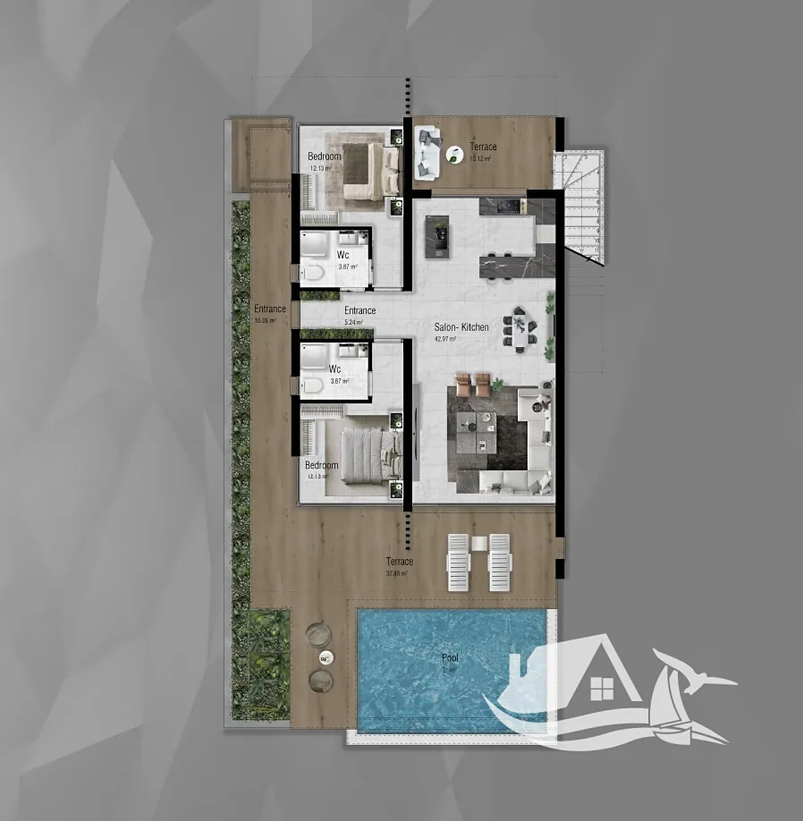 V projektů zůstalo pouze par vil v první linii , vila 3+kk má dvě ložnice, dvě koupelny , velká střešní terasa a bazén.