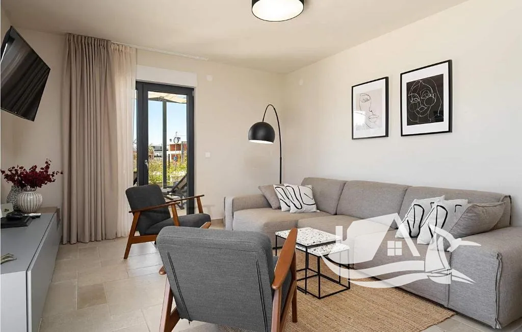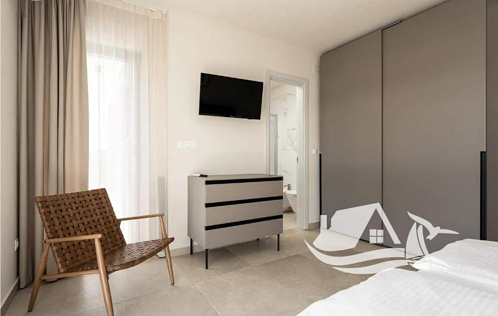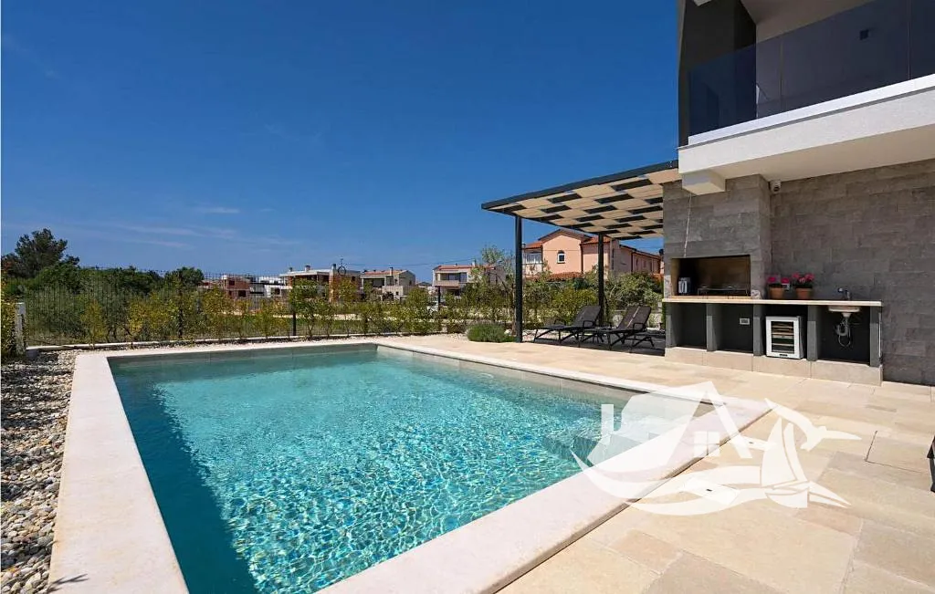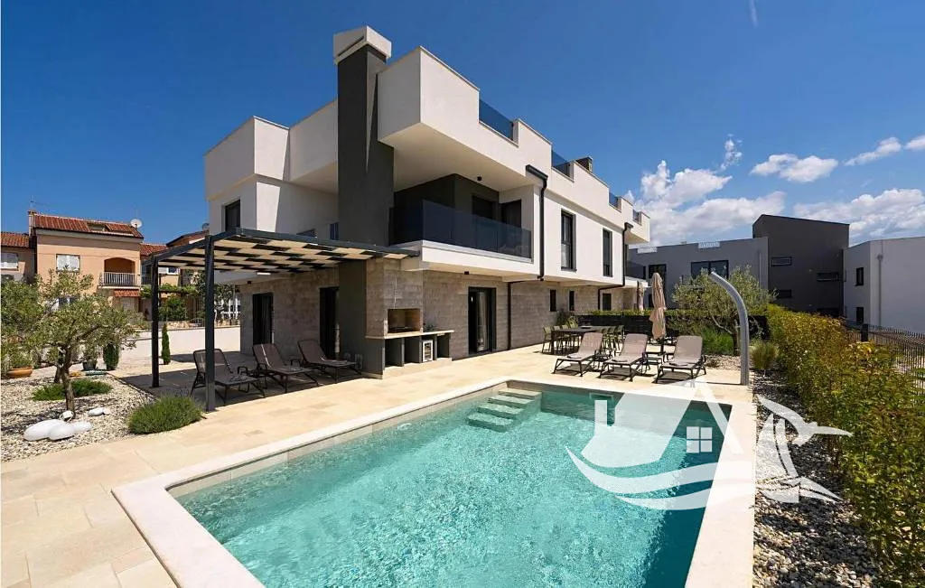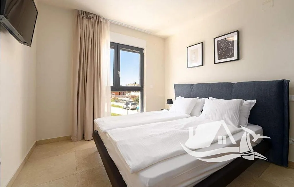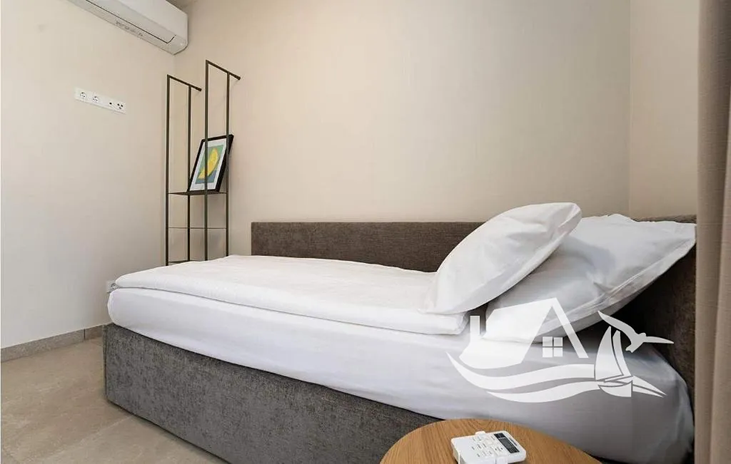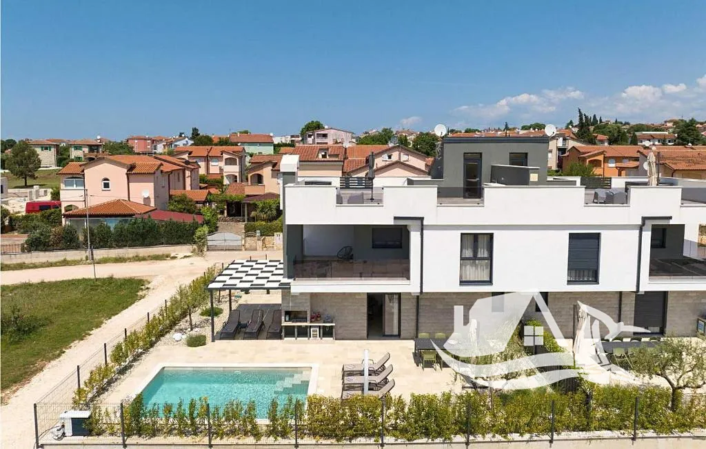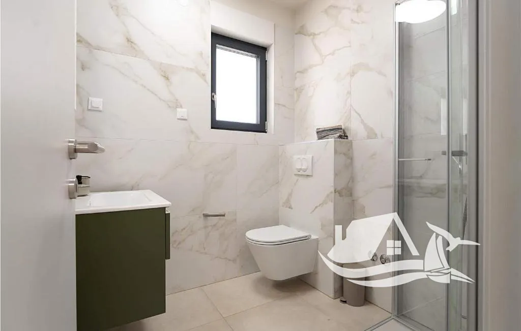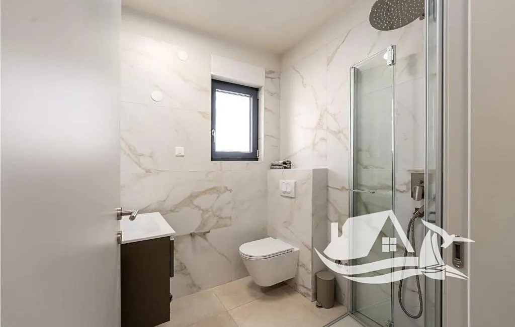 Tato vila (dvojdům)stojí na pozemku o rozloze 366 m² a její obytná plocha činí celkem 150 m². Dům je rozdělen do tří podlaží – přízemí, první patro a střešní terasa – a nabízí naprosto vše, co od moderního a pohodlného bydlení u moře očekáváte. Architektonicky je dům navržen s ohledem na praktičnost, estetiku a maximální využití prostoru. Přitom si zachovává příjemně domácký charakter a je ideální jak pro trvalé bydlení, tak i pro sezónní využití nebo krátkodobý pronájem.