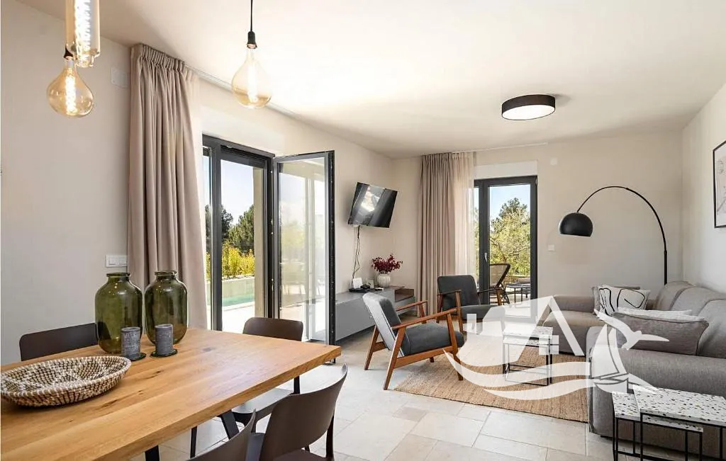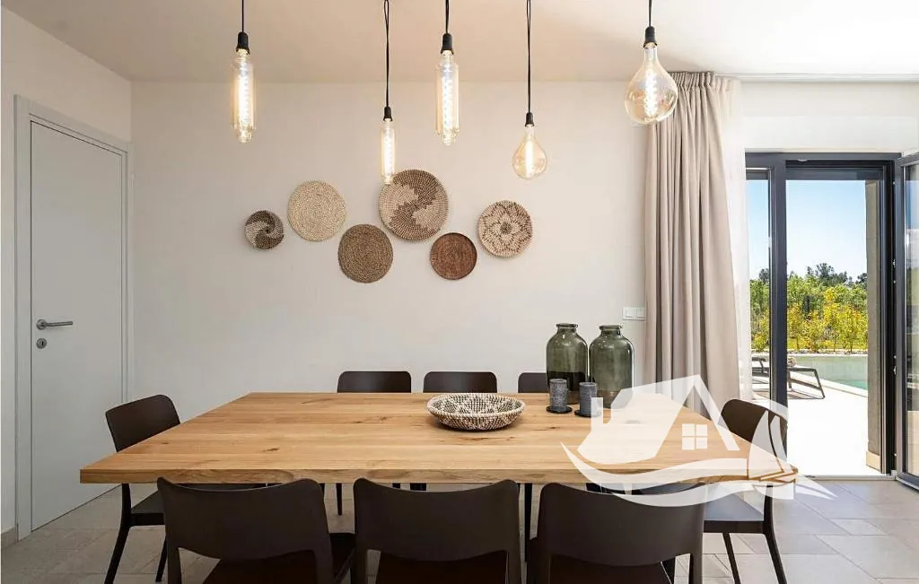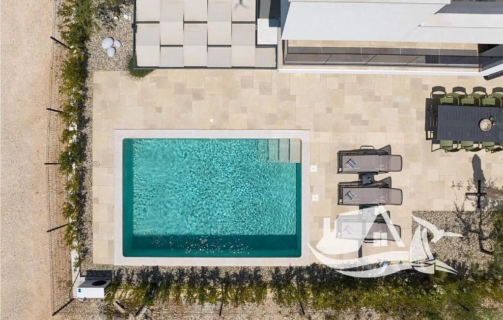 Z obývacího pokoje v přízemí je přímý vstup na venkovní terasu, kde se nachází soukromý bazén o velikosti 24 m². Tato část zahrady je ideální pro slunění, relaxaci nebo hraní s dětmi. Vedle bazénu je kryté posezení s další venkovní kuchyní, což rozšiřuje možnosti využití domu během letních měsíců. Všechny tyto venkovní prvky dohromady vytvářejí prostředí, které ocení každý, kdo miluje středomořský styl života – jednoduchý, pohodlný, spojený s přírodou a přesto plně komfortní.