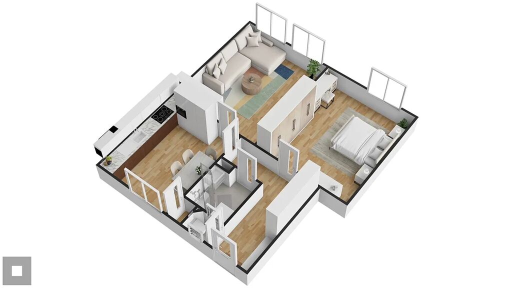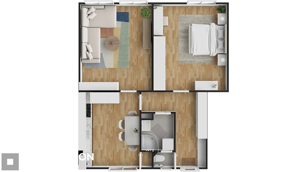 Byt má praktické dispoziční řešení – samostatnou kuchyni (12,5 m²), obývací pokoj (18,2 m²), ložnici (17,4 m²), předsíň, koupelnu se sprchovým koutem (rok renovace 2006), samostatné větratelné WC a malou spíž. Výška stropů je příjemných 2,8 m.