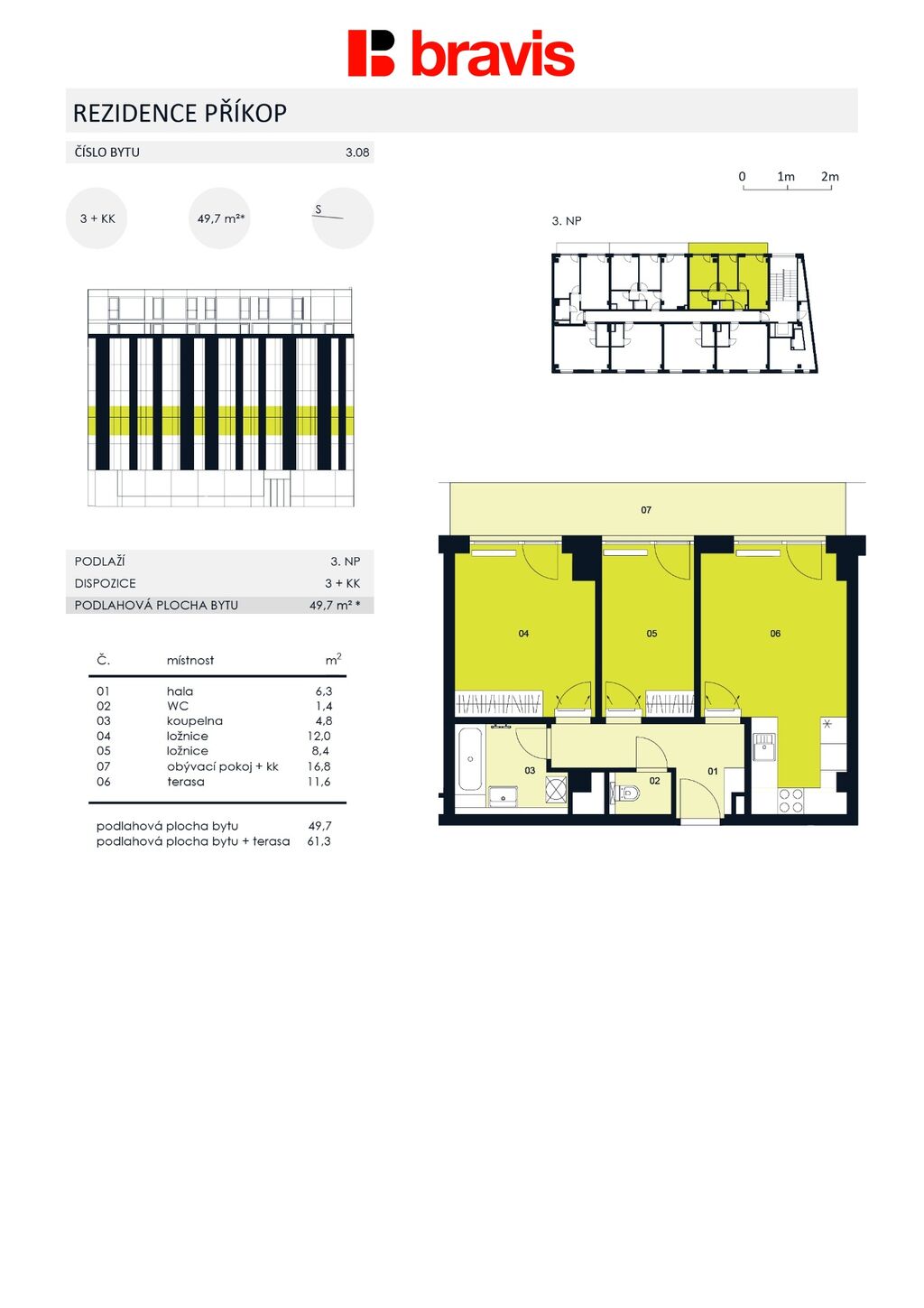 K bytu náleží terasa o rozměru 12 m2, se vstupem ze všech tří místností.