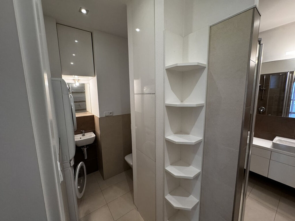 Součástí ložnice je velká postel se dvěmi nočními stolky, rohovou skříní a velkou vestavěnou skříní. V koupelně je sprchový kout, umyvadlo, toaleta, skříň pod umyvadlem, pračka a sušička.