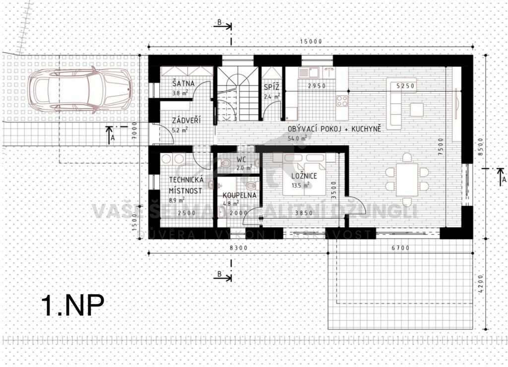 Rodinné domy typu B mají zastavěnou plochu 128m2 a podlahovou plochu 191,6m2