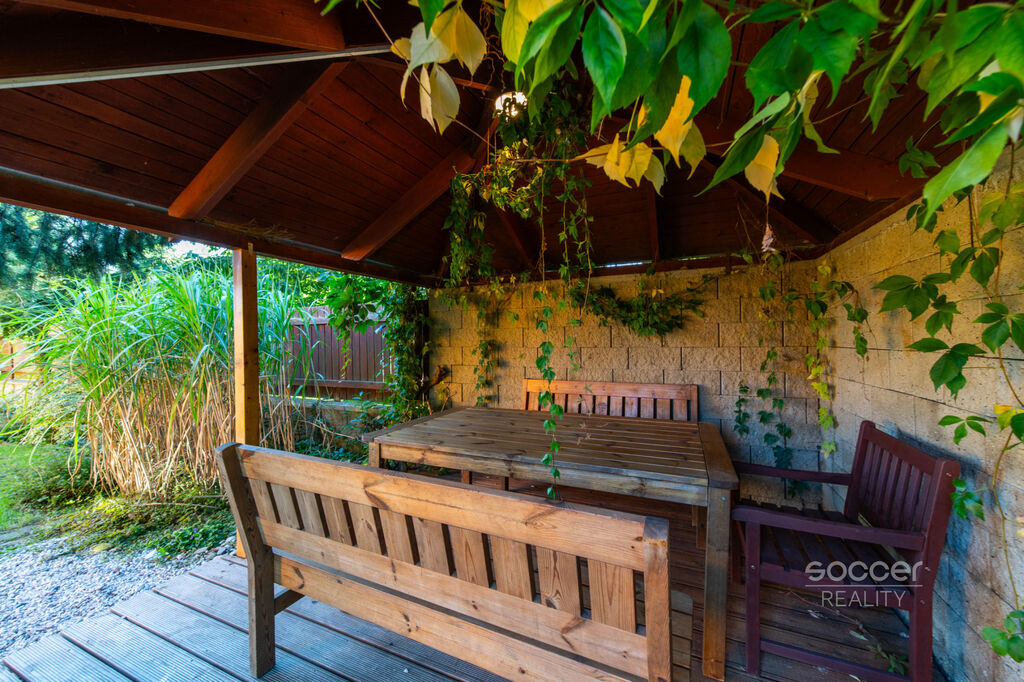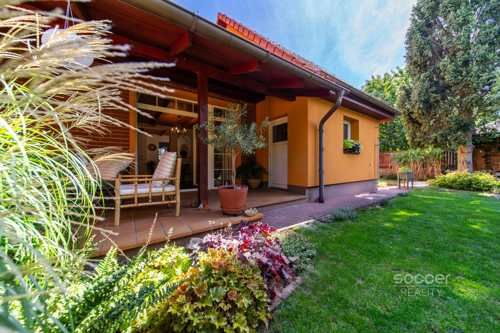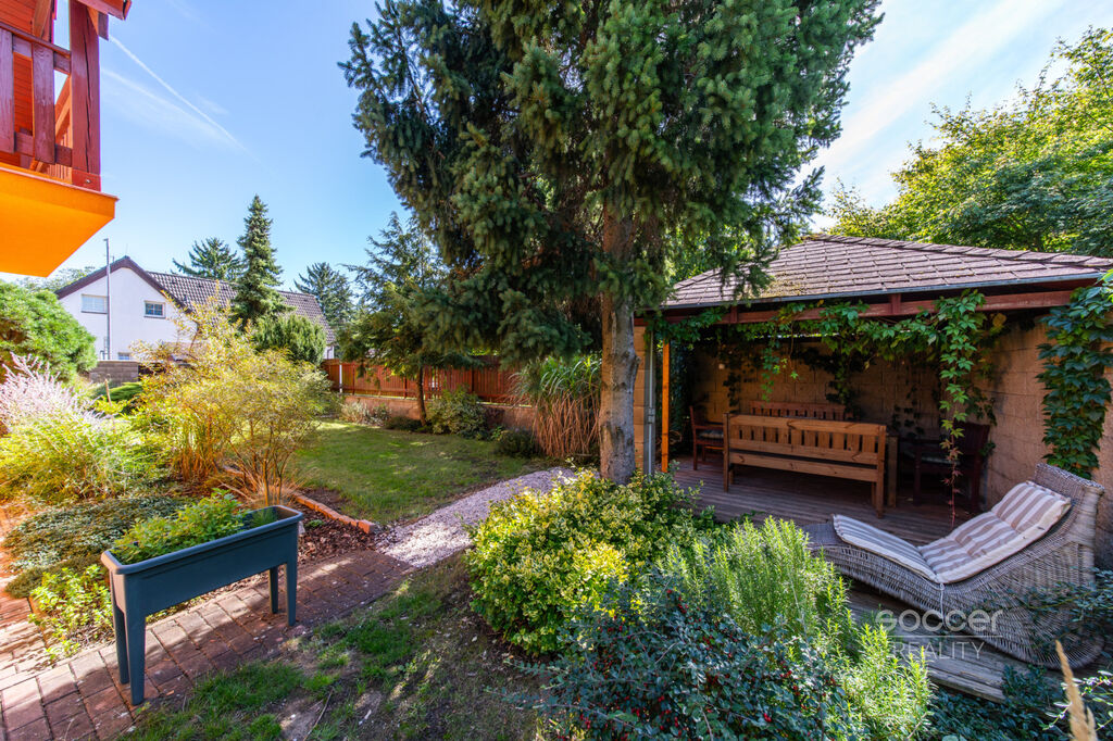 Pozemek kolem domu nabízí příjemnou zahradu se vzrostlými stromy a okrasnými keři, které v létě zajišťují dostatek stínu i soukromí. Na zahradě je zahradní domek a zastřešená pergola ideální k odpočinku či posezení s přáteli. Zpevněné plochy kolem domu jsou provedeny ze zámkové dlažby, parkovat lze v garáži i na pozemku.