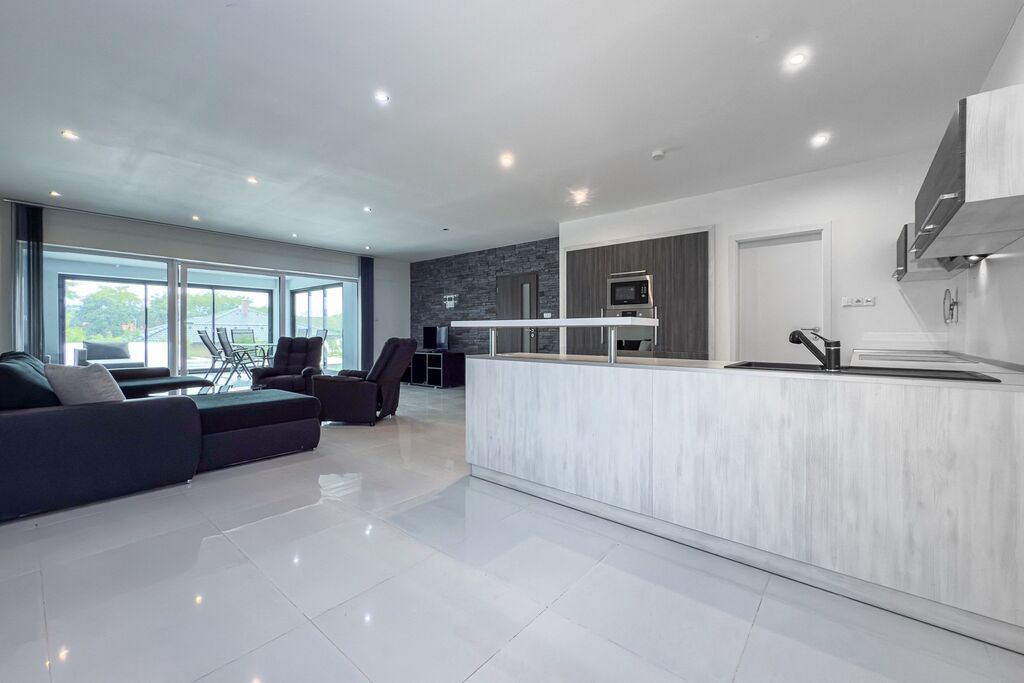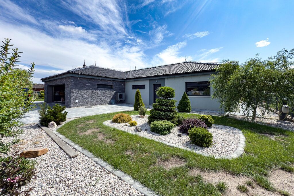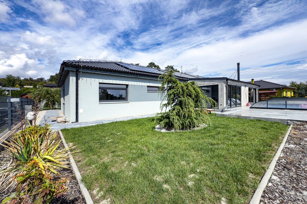 Dispozice domu: vstupní předsíň, technická místnost, šatna, koupelna, WC, tři obytné pokoje a prostorný obývací pokoj s kuchyní (včetně praktické komory). Velkým benefitem je zimní zahrada přímo navazující na obývací část.