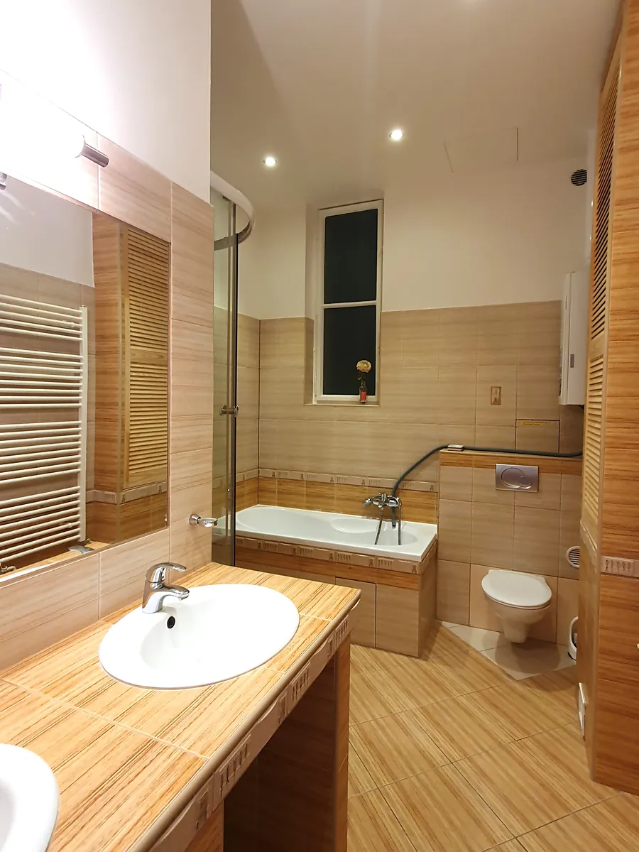 Koupelna s vanou, sprchovacím koutem a toaletou je uprostřed chodby.
