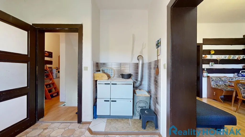 Po dřevěném schodišti vystoupáme na horní chodbu (5,9 m2), ze které vstupujeme do samostatných místností: kuchyně (13,0 m2), jídelny (15,5 m2), obývacího pokoje (27,6 m2), a ložnice (9,8 m2). Z horní chodby můžeme dále vystoupat do dosud nevyužívaného půdního prostoru (79,6 m2), kde lze současnou dispozici domu dále rozvíjet. Ze spodní chodby sestupujeme do klenutého sklepa (17,5 m2). Zahrada za domem nabízí vedlejší stavby: dílnu (14,3 m2), se skladem zahradního nábytku (1,4 m2) a stodolu (63,7 m2), se zastřešeným dřevníkem (13,0 m2).