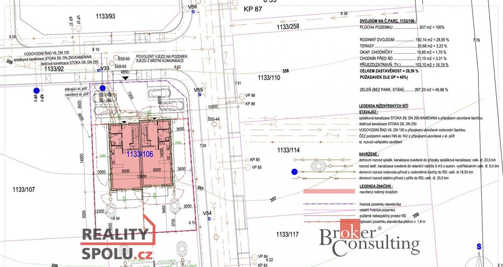 Celková výměra pozemku je 637 m², přičemž k této polovině domu náleží cca 318 m² zahrady s příjezdem a parkováním.