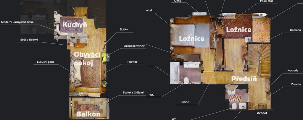 přírodní dubové parkety, ručně vyráběný nábytek z přírodního ořechu, kuchyň s přírodním africkým kamenem, bezpečnostní vstupní dveře na míru, klimatizaci v obývacím pokoji (chlazení i vytápění), Smart Home systém pro regulaci vytápění