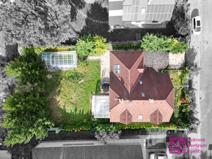 Celý pozemek domu je oplocen. Zahrada s vzrostlými stromy a krytým bazénem zajištuje dostatek soukromí. Pro Vaše děti je před domem, avšak na oploceném pozemku menší dětské hřiště.