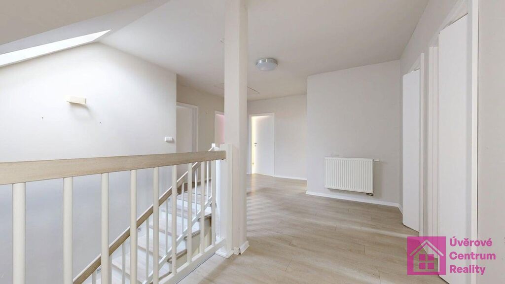 2.nadzemní podlaží: schodiště, pokoj, chodba, koupelna (vana), toaleta, pracovna a tři pokoje.