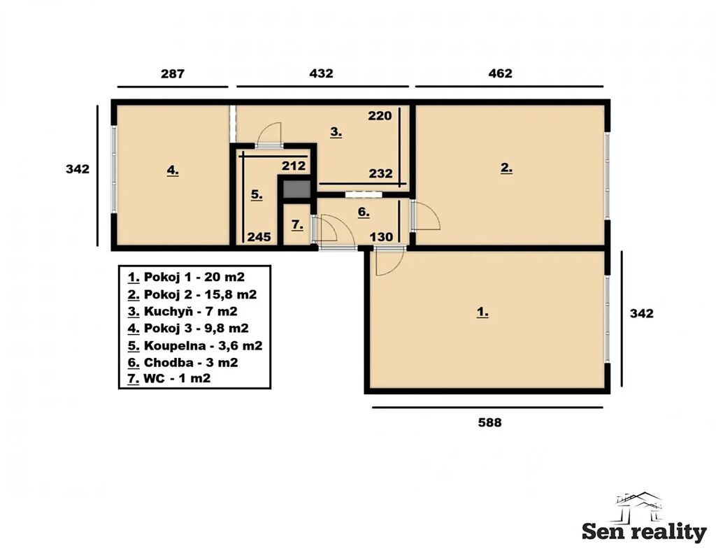 Dispozici bytu tvoří obývací pokoj, prostorná ložnice, neprůchozí pokoj, kuchyň, koupelna, samostatné WC, chodba.