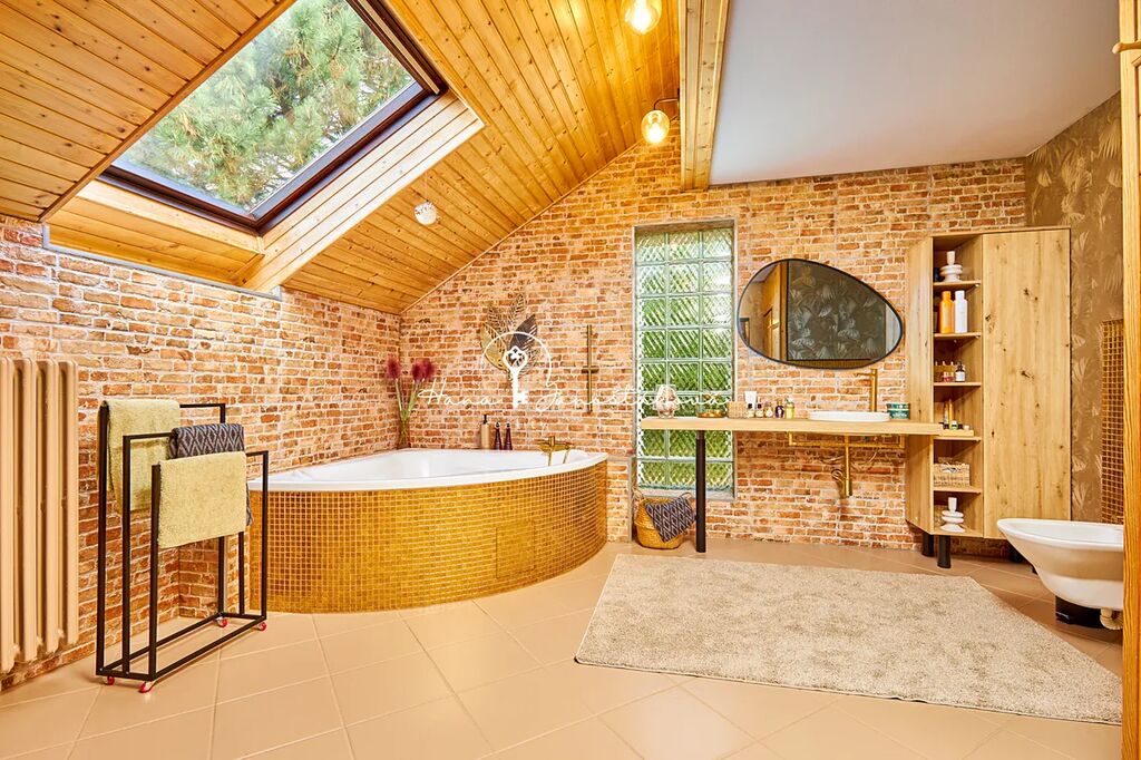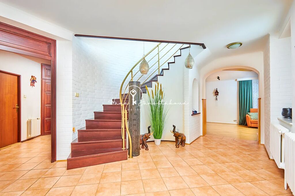 V patře jsou tři ložnice a pracovna, hala a dvě koupelny. Součástí velké koupelny je krásná dřevěná sauna, rohová vana a toaleta s bidetem. Vysoká pracovna je zajímavě rozčleněna dřevěnou galerií. Jedna z ložnic je mezonetová, kde v horní části je spací prostor.