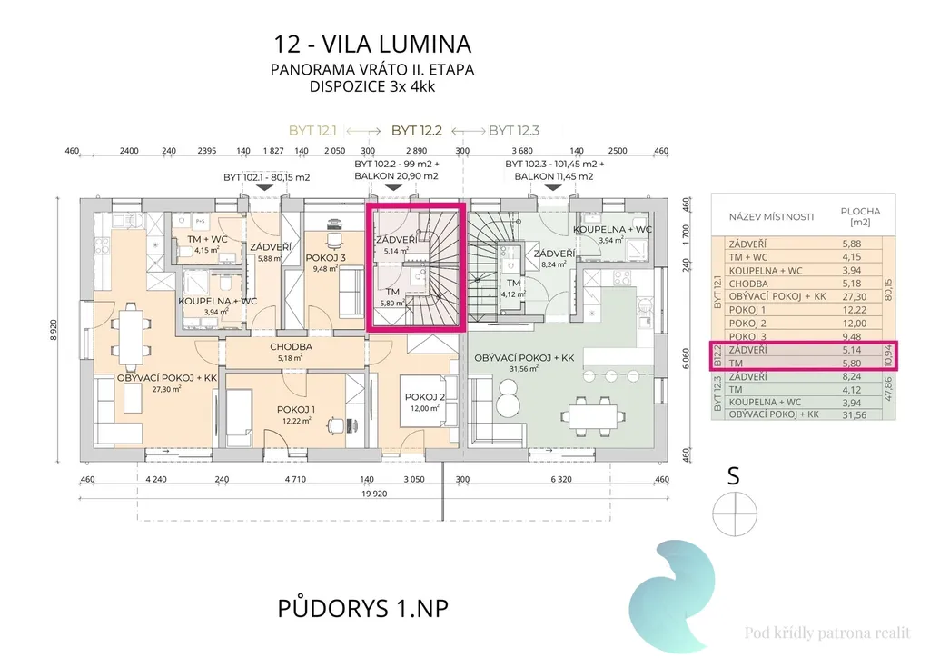 A samozřejmě byt o dispozici 4+kk a ploše 99 m², který působí díky chytré dispozici ještě větší.