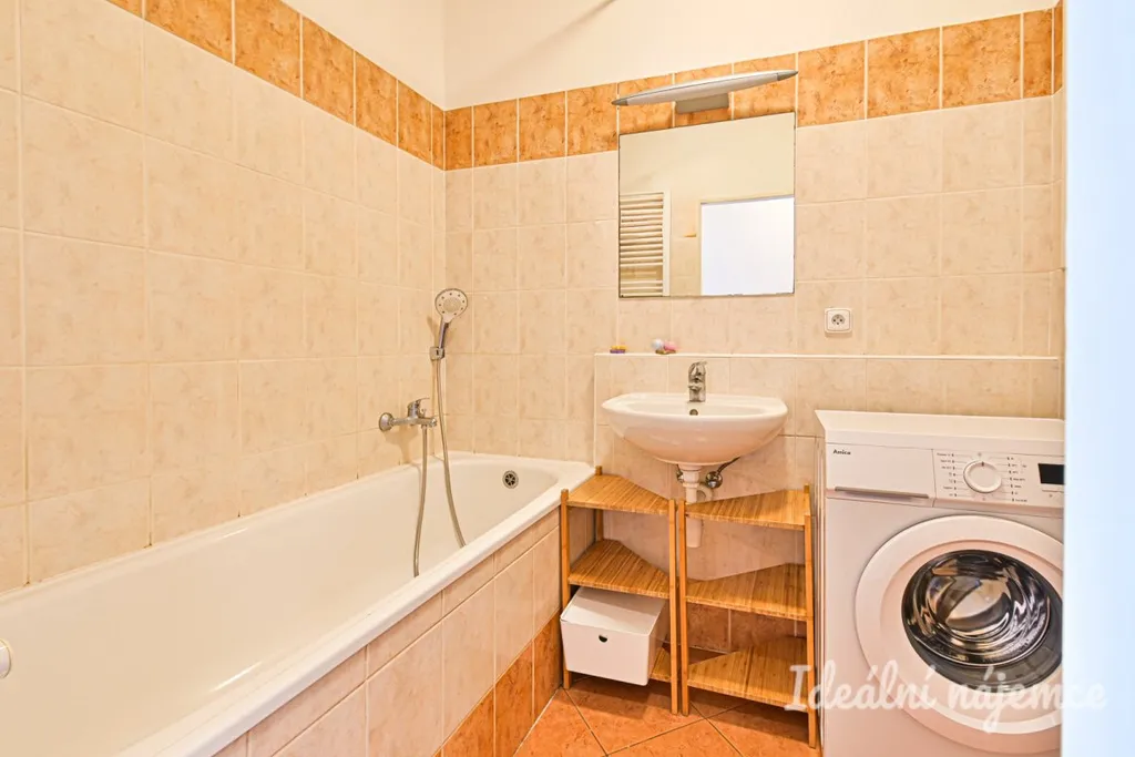 Součástí bytu je kuchyňská linka s elektrickou troubou, varnou deskou, myčkou, mikrovlnnou troubou a lednicí. V obytné části nalezneme pohovku, postel, jídelní stůl se židlemi a úložné prostory. V koupelně je vana, pračka, umyvadlo a toaleta. Byt se nabízí vybavený dle fotografií.