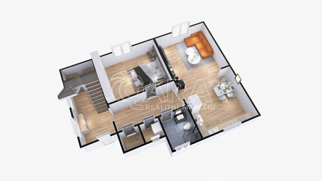 V patře: Zde se nachází klidová zóna s velkou ložnicí, dětským pokojem, prostornou kanceláří a druhou, hlavní koupelnou.