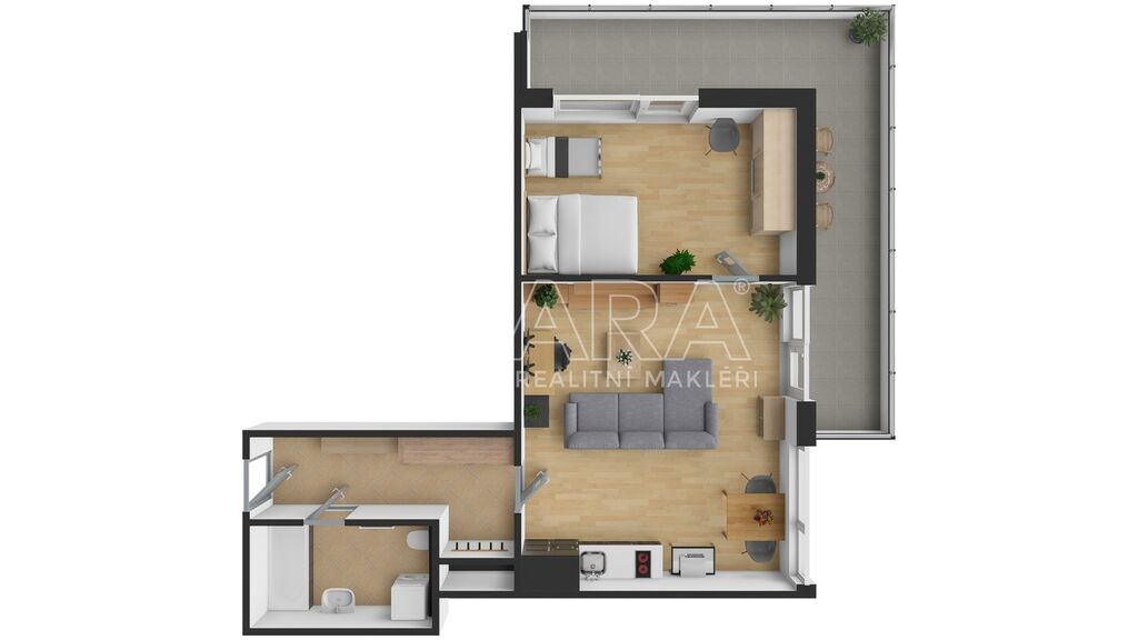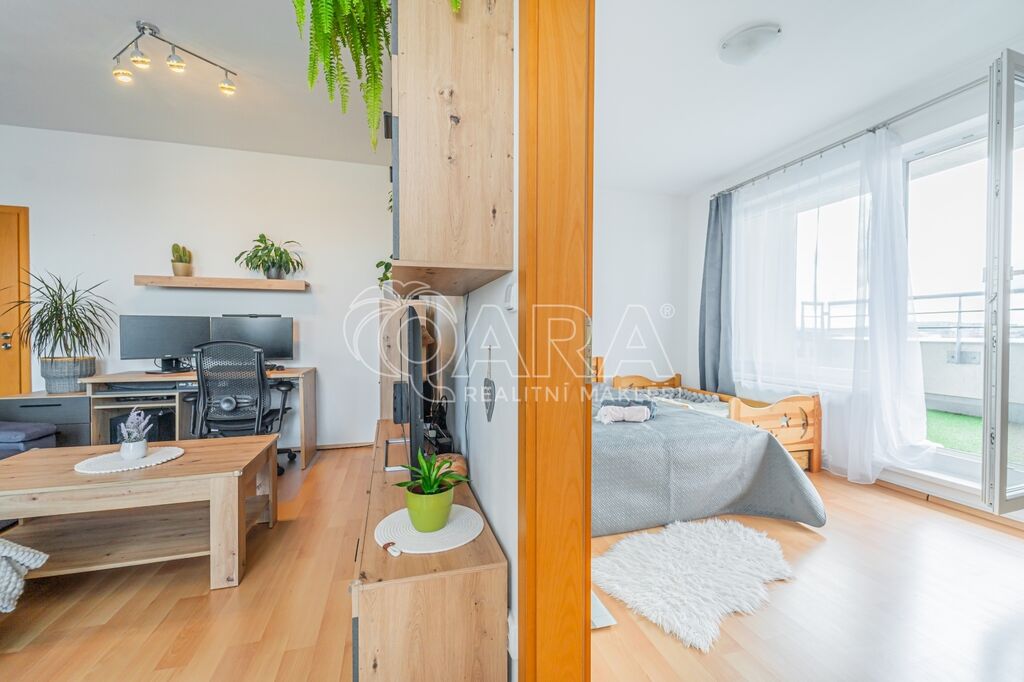 Po vstupu do bytu je příjemně široká chodba, která nabízí dostatek místa pro botník i šatní skříň. Z chodby se vstupuje do koupelny vybavené vanou, toaletou a místem pro pračku. Dále pak do hlavní obytné místnosti s kuchyňským koutem, která poskytuje prostor pro jídelní část i pracovní koutek. Na obývací pokoj navazuje ložnice, která má samostatný vstup na terasu, na její zastřešenou část. Terasa propojuje obě místnosti a nabízí posezení i odpočinek s orientací na dvě světové strany.
