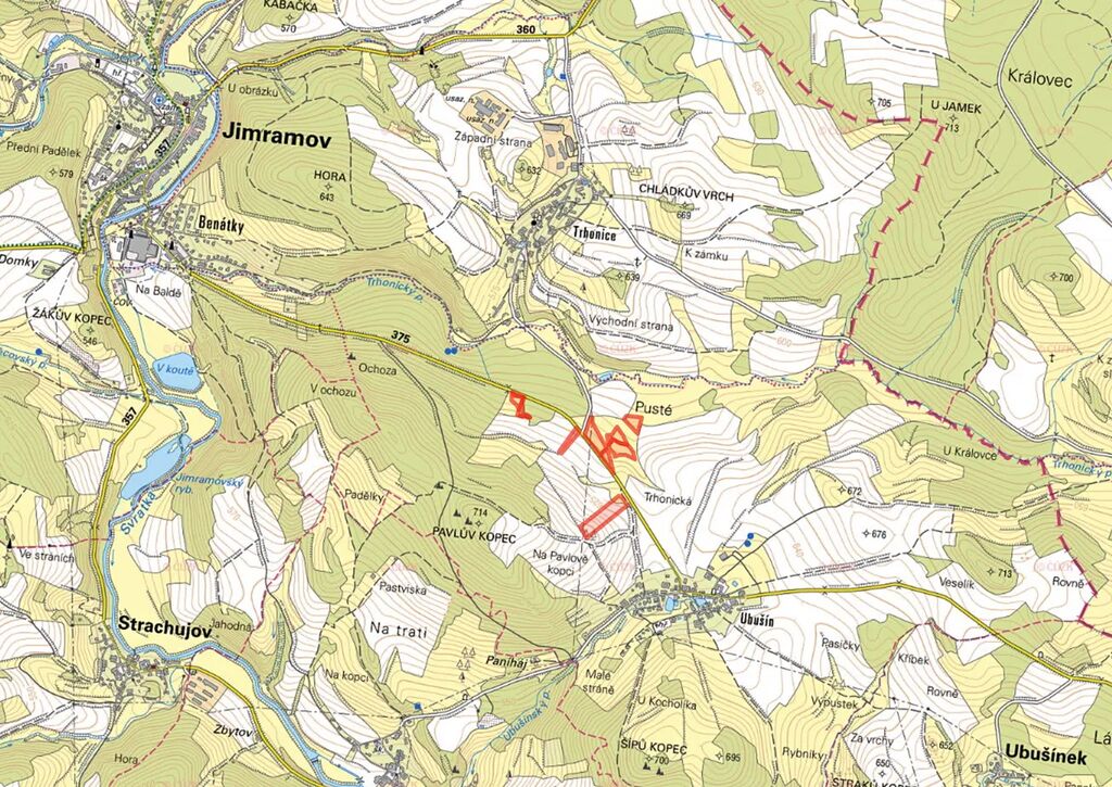 Celková výměra pozemků je 25 411 m² a jedná se o kombinaci orné půdy a trvale travního porostu. Rozkládají se podél cesty severozápadně od obce Ubušín směrem na Jimramov. Pozemky, které neleží přímo u zpevněné cesty mají dle katastru nemovitostí zajištěn přístup po obecních parcelách.
