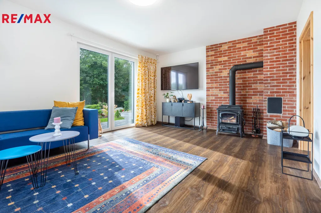 * **Dispozice 4+kk** – vzdušný obývací prostor s krbem a kuchyňským koutem, tři útulné ložnice v patře, dvě koupelny