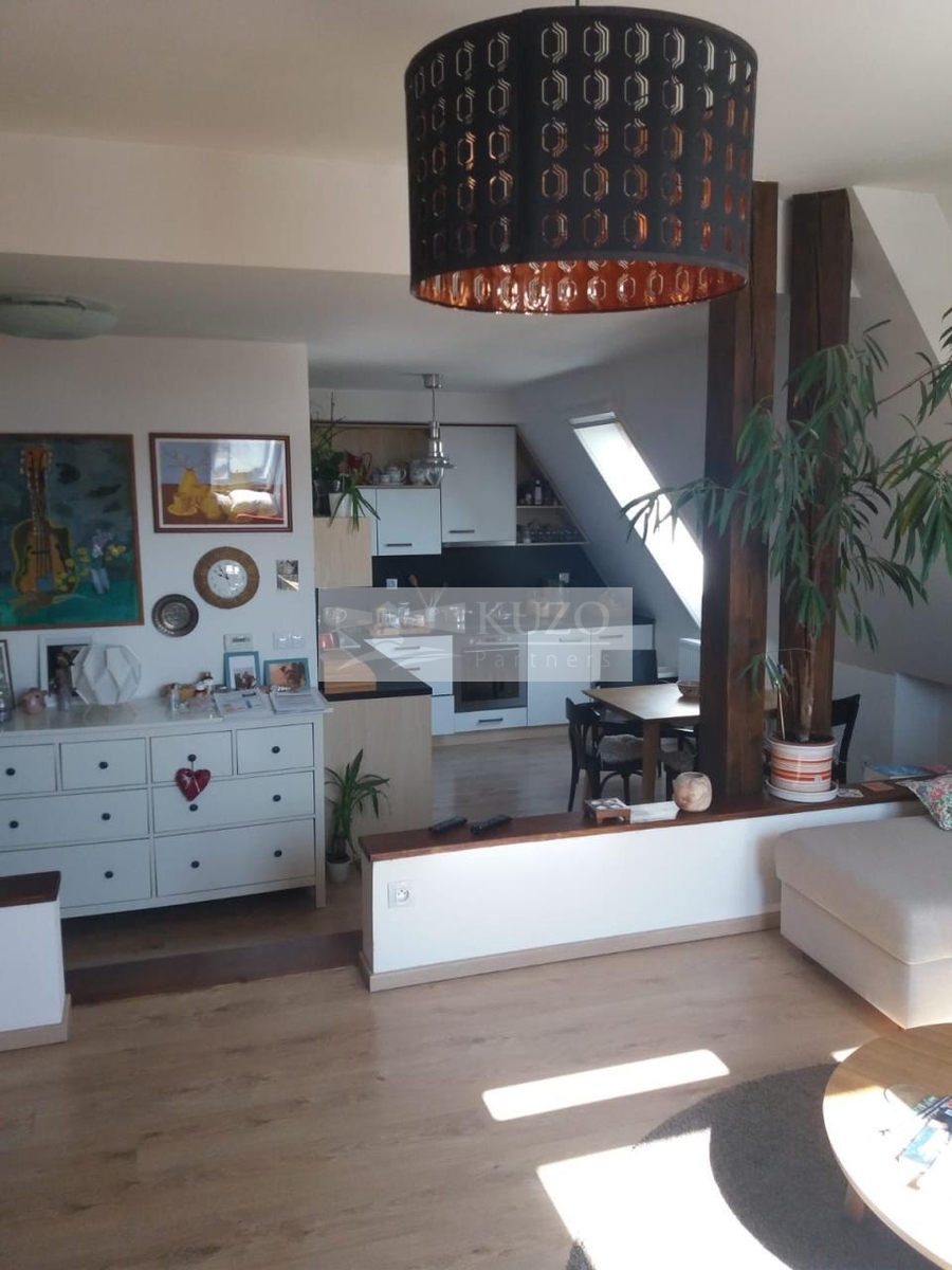 Jedná se o atypický podkrovní byt s kouzelnou atmosférou, pro jednoho nebo pro dva. V domě je jen 9 bytů a rodinná atmosféra. Klidná lokalita u malebného nádraží, v mírném kopečku. V bytě je plynový kotel Buderus - k ohřevu vody a topení, kuchyňská linka se spotřebiči, velmi úložné šatní skříně na míru, klimatizace a ve střešních oknech sítě proti hmyzu a roletky. V koupelně je velká rohová vana. Kouzelnou atmosféru dodávají přiznané dřevěné trámy. K bytu náleží jedno venkovní stání na auto.