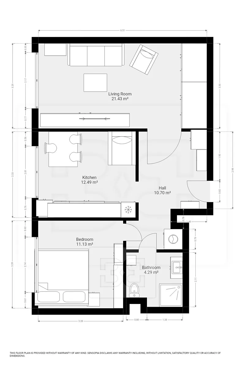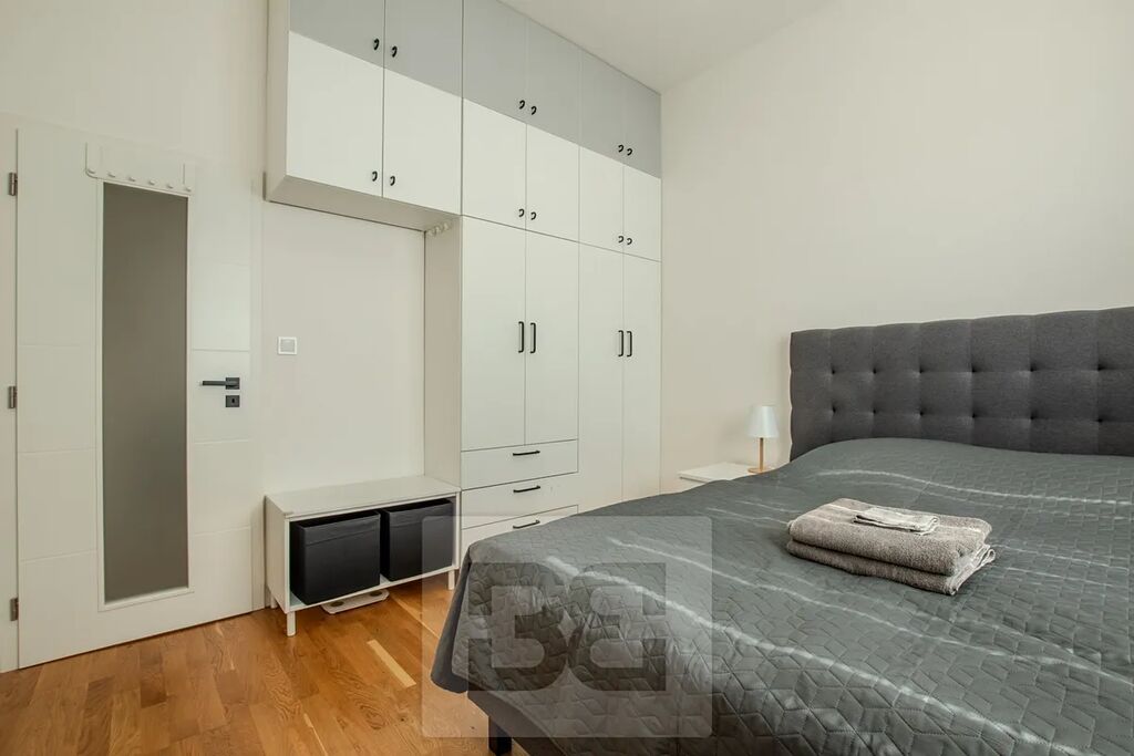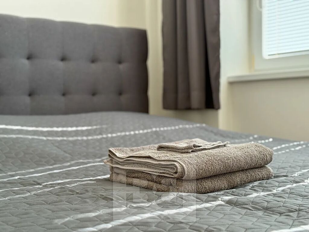 Obývací pokoj je vybaven pohovkou, křeslem, TV a vestavěnou šatní skříní. Ložnice nabízí manželskou postel a další vestavěnou skříň. Uprostřed bytu se nachází prostorná kuchyň, která díky vybavení může sloužit i jako menší obývací prostor. K dispozici je plně vybavená kuchyňská linka, jídelní stůl, menší pohovka a přípojka na televizi.
