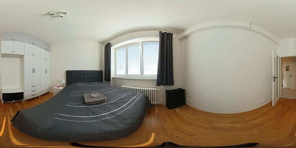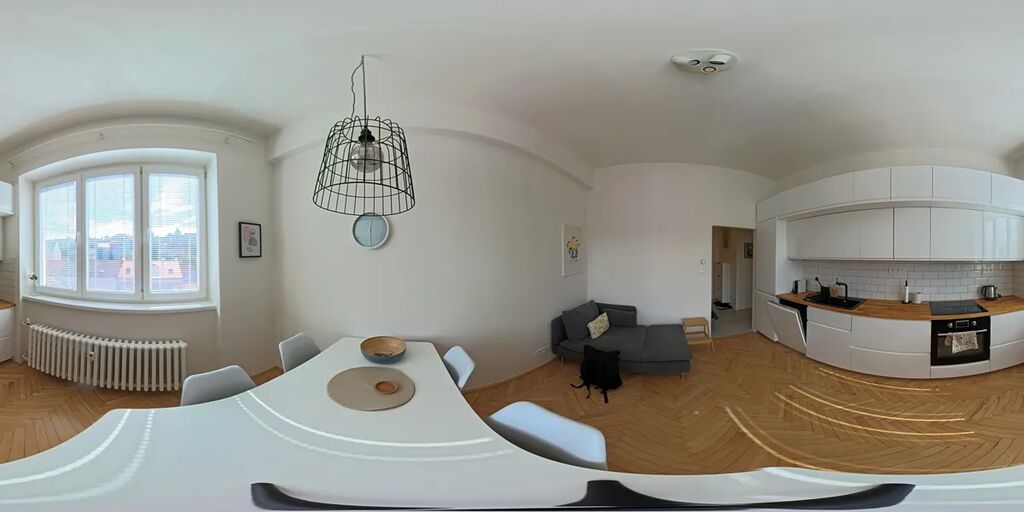 Interiér bytu zdobí dřevěné podlahy, na všech oknech jsou žaluzie. Komfort bydlení zvyšuje podlahové vytápění.