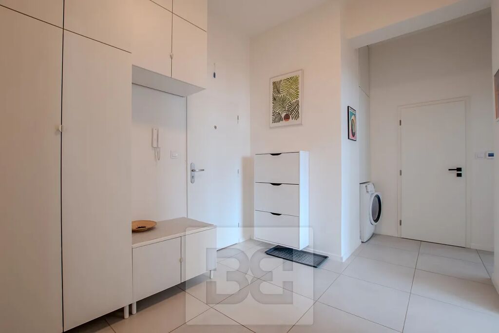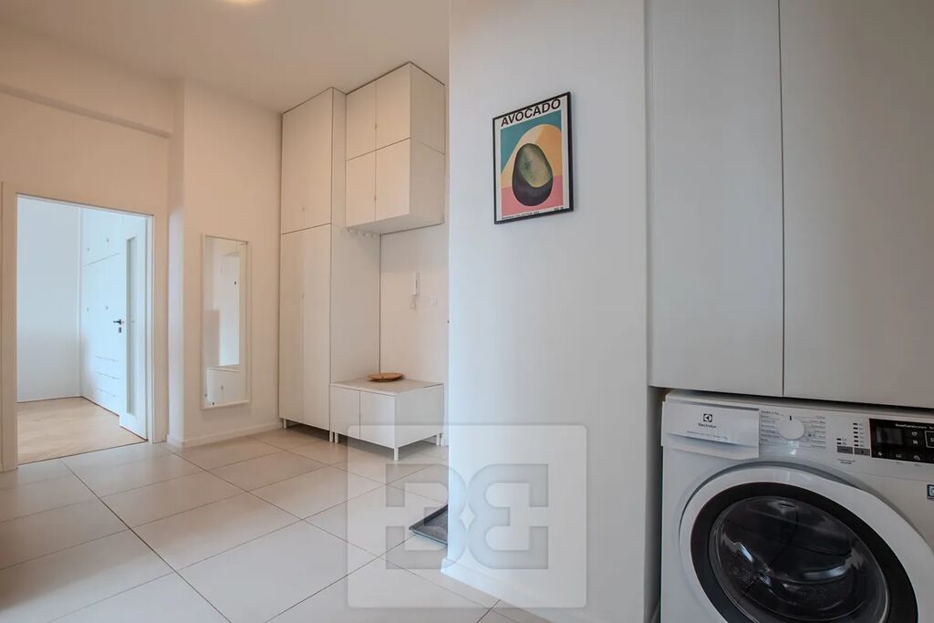 Byt je kompletně vybaven. Dispozici tvoří prostorná předsíň s vestavěnou skříní, botníkem, pračkou a úložnou skříní nad pračkou. Hlavní pokoje jsou oddělené a neprůchozí.