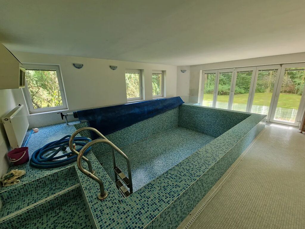 V přízemí domu instalován vnitřní bazén (5,35 x 3,45m s max. hloubkou 1,4m). Bazénová místnost disponuje zařízením na automatickou regulací PH.