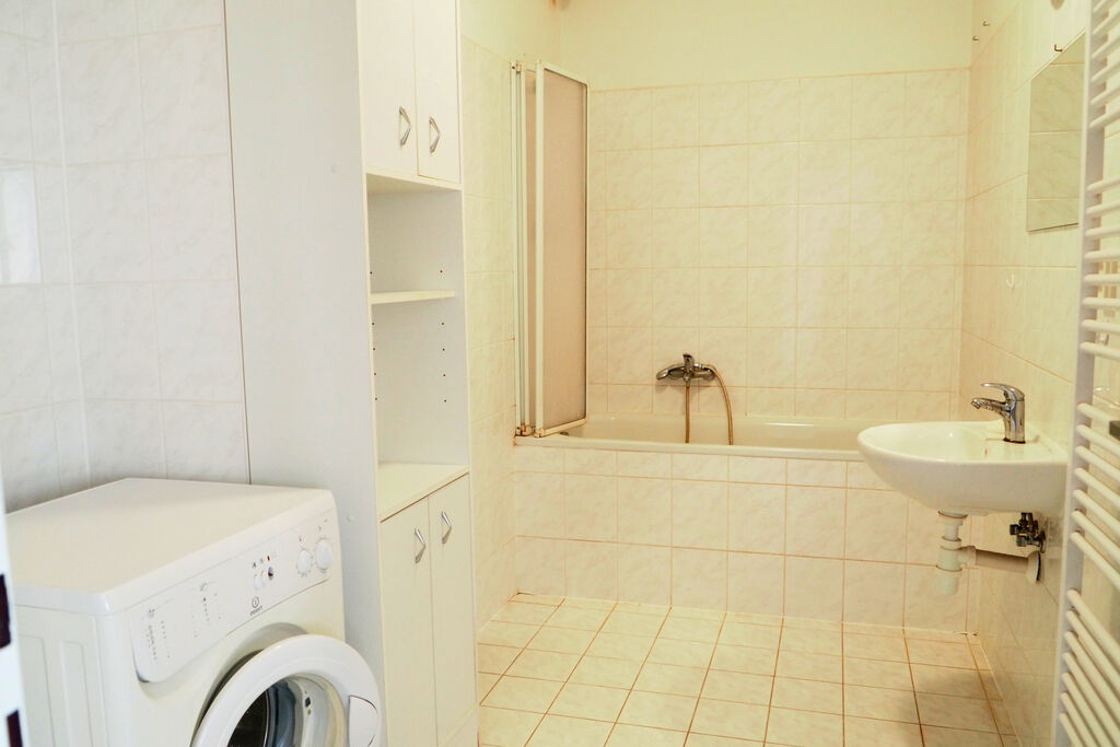V koupelně se nachází vana a pračka.