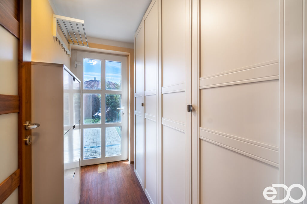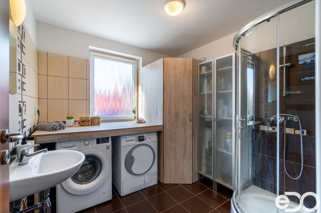 Přízemí – prostorný obývací pokoj s kuchyňským koutem (plně vybavená kuchyňská linka, orientace J/Z), přístup na krytou terasu přes francouzské okno, pracovna/posilovna, koupelna se sprchovým koutem a technickým zázemím, samostatné WC, vstupní chodba, úložný prostor pod schodištěm.