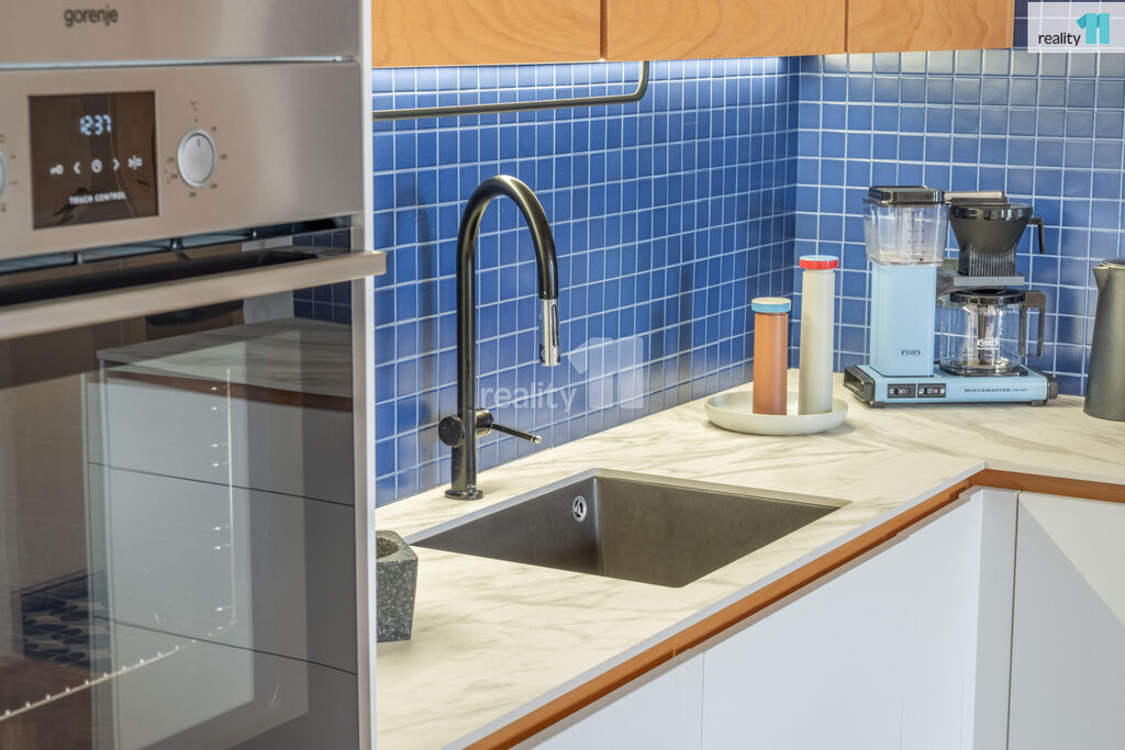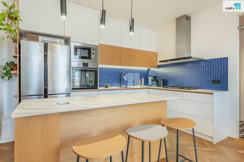 Kuchyň je propojena s obývacím pokojem se vstupem na balkón, kde si vychutnáte kávu s výhledem do klidného vnitrobloku nebo ugrilujete něco dobrého. Od obývacího pokoje je oddělena kuchyňským ostrůvkem, který je připojen na elektřinu, a barovými židlemi. Kuchyňská linka je v bezúchytkovém provedení s matným povrchem, má dostatek úložného prostoru, zabudované spotřebiče a o oživení prostoru se postarala modrá mosaika jako obklad. Linka je z boku lednice zakončena krycí perforovanou bukovou deskou, kde lze umístit poličky či případné dekorace.